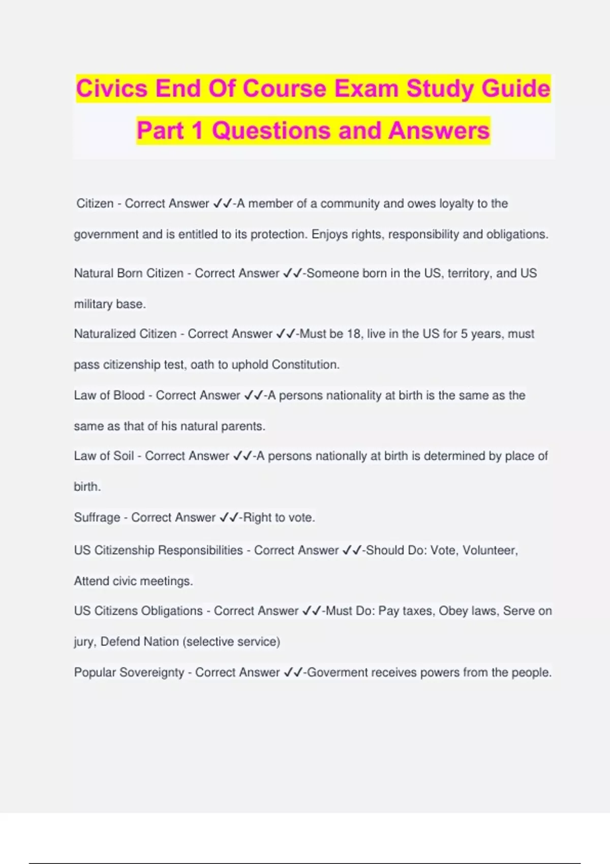 Civics End Of Course Exam Study Guide Part 1 Questions and Answers Citizen - Correct Answer ️️ -A member of a community and owes loyalty to the government and is entitled to its protection. Enjoys rights, responsibility and obligations. Natural Born Citizen - Correct Answer ️️ -Someone born in the US, territory, and US military base. Naturalized Citizen - Correct Answer ️️ -Must be 18, live in the US for 5 years, must pass citizenship test, oath to uphold Constitution. Law of Blood - Correct Answer ️️ -A persons nationality at birth is the same as the same as that of his natural parents. Law of Soil - Correct Answer ️️ -A persons nationally at birth is determined by place of birth. Suffrage - Correct Answer ️️ -Right to vote. US Citizenship Responsibilities - Correct Answer ️️ -Should Do: Vote, Volunteer, Attend civic meetings. US Citizens Obligations - Correct Answer ️️ -Must Do: Pay taxes, Obey laws, Serve on jury, Defend Nation (selective service) Popular Sovereignty - Correct Answer ️️ -Goverment receives powers from the people