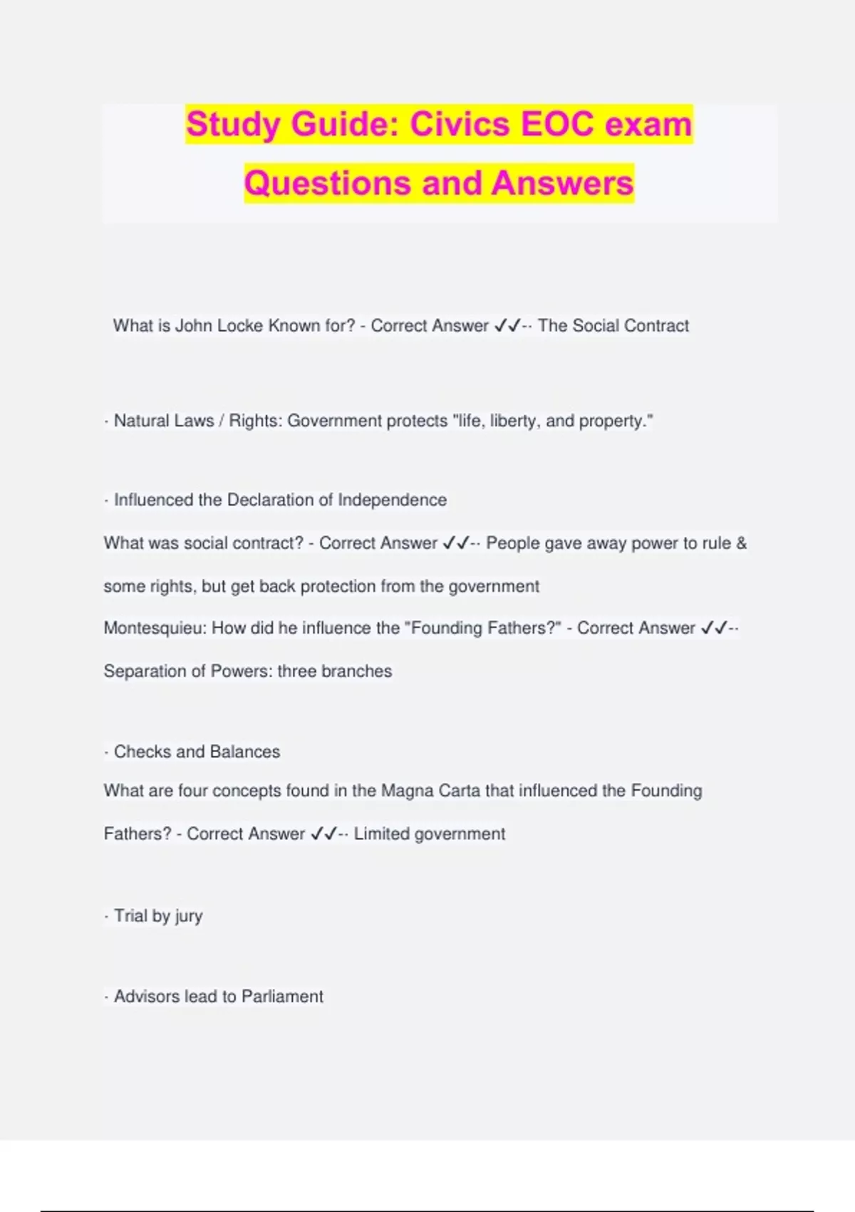 Study Guide: Civics EOC exam Questions and Answers What is John Locke Known for? - Correct Answer ️️ -· The Social Contract · Natural Laws / Rights: Government protects "life, liberty, and property." · Influenced the Declaration of Independence What was social contract? - Correct Answer ️️ -· People gave away power to rule & some rights, but get back protection from the government Montesquieu: How did he influence the "Founding Fathers?" - Correct Answer ️️ -· Separation of Powers: three branches · Checks and Balances What are four concepts found in the Magna Carta that influenced the Founding Fathers? - Correct Answer ️️ -· Limited government · Trial by jury · Advisors lead to Parliament · Rule of Law List three rights that are found in the English Bill of Rights that are found in the US Bill of Rights: - Correct Answer ️️ -· Freedom of Speech · No cruel and unusual punishment · No taxes w/o consent Name three concepts in the Mayflower Compact that influenced the Founding Fathers: - Correct Answer ️️ -· Self-government · The rule of law · Social Contract What did Thomas Paine's Common Sense influence the Founding Fathers to do? - Correct Answer ️️ -· "Common Sense" to declare independence from Great Britain. Influenced Declaration of Independence List three things that the British did that made the Colonists angry? - Correct Answer ️️ -· Stamp Act · Quartering Act, Tea Act · No taxation w/o representation Who was the "Grievances" of the Declaration of Independence addressed to? King George III - Correct Answer ️️ -King George III What rights did Thomas Jefferson say every American is entitled to in the Declaration of Independence? - Correct Answer ️️ -Life, liberty, and the pursuit of happiness Which Enlightenment philosopher influenced Jefferson in the "Natural Rights" section of the Declaration of Independence? - Correct Answer ️️ -John Locke List three weaknesses of the Articles of Confederation: - Correct Answer ️️ -· One branch: no judicial or executive branch · No power to tax, regulate trade or enforce laws · Too rigid: 9 out 13 states to pass laws, 13 out of 13 to pass amendments List the goals of the Preamble and describe what they mean: - Correct Answer ️️ -• "We the people" - popular sovereignty the people are the source of government power • "A more perfect union" - to make a better country and a stronger government than under the Articles of Confederation • "Establish justice" - fairness/equality, represented by our court system • "Ensure domestic tranquility" - keep the peace inside the country - usually the police • "Provide the common defense" - keep the country safe from other countries, the military • "Promote the general welfare" - help people • "Secure the blessings of liberty" - provide freedom • "To ourselves and our posterity" - rights and freedom for now and the future Define Separation of Power: - Correct Answer ️️ -divide power into three branches Define Checks and Balances: - Correct Answer ️️ -Each branch che