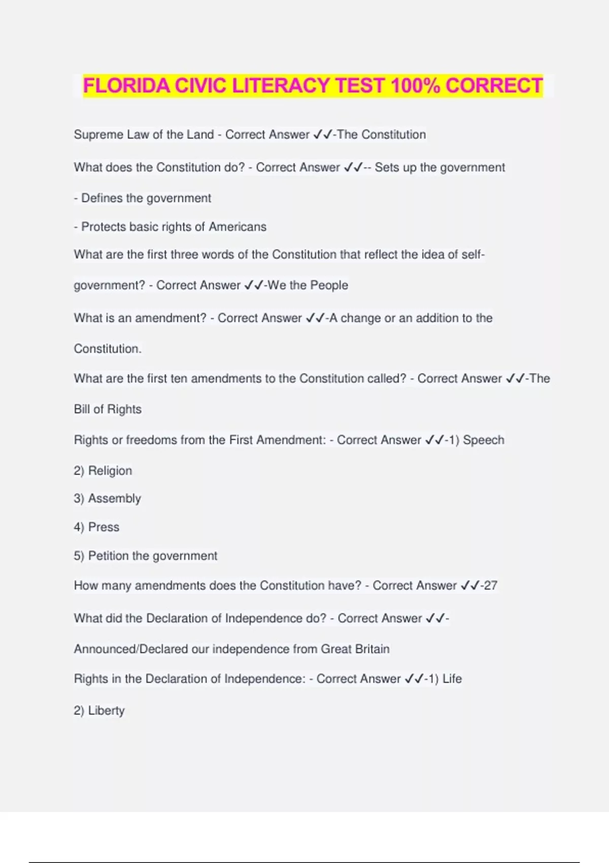 FLORIDA CIVIC LITERACY TEST 100% CORRECT Supreme Law of the Land - Correct Answer ️️ -The Constitution What does the Constitution do? - Correct Answer ️️ -- Sets up the government - Defines the government - Protects basic rights of Americans What are the first three words of the Constitution that reflect the idea of self- government? - Correct Answer ️️ -We the People What is an amendment? - Correct Answer ️️ -A change or an addition to the Constitution. What are the first ten amendments to the Constitution called? - Correct Answer ️️ -The Bill of Rights Rights or freedoms from the First Amendment: - Correct Answer ️️ -1) Speech 2) Religion 3) Assembly 4) Press 5) Petition the government How many amendments does the Constitution have? - Correct Answer ️️ -27 What did the Declaration of Independence do? - Correct Answer ️️ - Announced/Declared our independence from Great Britain Rights in the Declaration of Independence: - Correct Answer ️️ -1) Life 2) Liberty 3) Pursuit of Happiness What is the freedom of religion? - Correct Answer ️️ -You can practice any religion, or not practice a religion. What is the economic system in the United States? - Correct Answer ️️ - Capitalist/Market Economy What is the "rule of law"? - Correct Answer ️️ -- Everyone must f