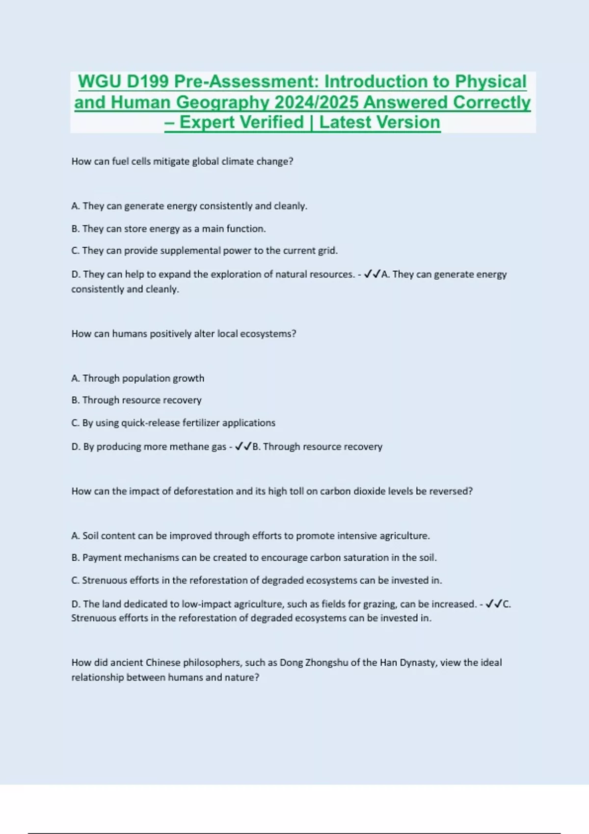How can fuel cells mitigate global climate change? A. They can generate energy consistently and cleanly. B. They can store energy as a main function. C. They can provide supplemental power to the current grid. D. They can help to expand the exploration of natural resources. - A. They can generate energy consistently and cleanly. How can humans positively alter local ecosystems? A. Through population growth B. Through resource recovery C. By using quick-release fertilizer applications D. By producing more methane gas - B. Through resource recovery How can the impact of deforestation and its high toll on carbon dioxide levels be reversed? A. Soil content can be improved through efforts to promote intensive agriculture. B. Payment mechanisms can be created to encourage carbon saturation in the soil. C. Strenuous efforts in the reforestation of degraded ecosystems can be invested in. D. The land dedicated to low-impact agriculture, such as fields for grazing, can be increased. - C. Strenuous efforts in the reforestation of degraded ecosystems can be invested in. How did ancient Chinese philosophers, such as Dong Zhongshu of the Han Dynasty, view the ideal relationship between humans and nature?