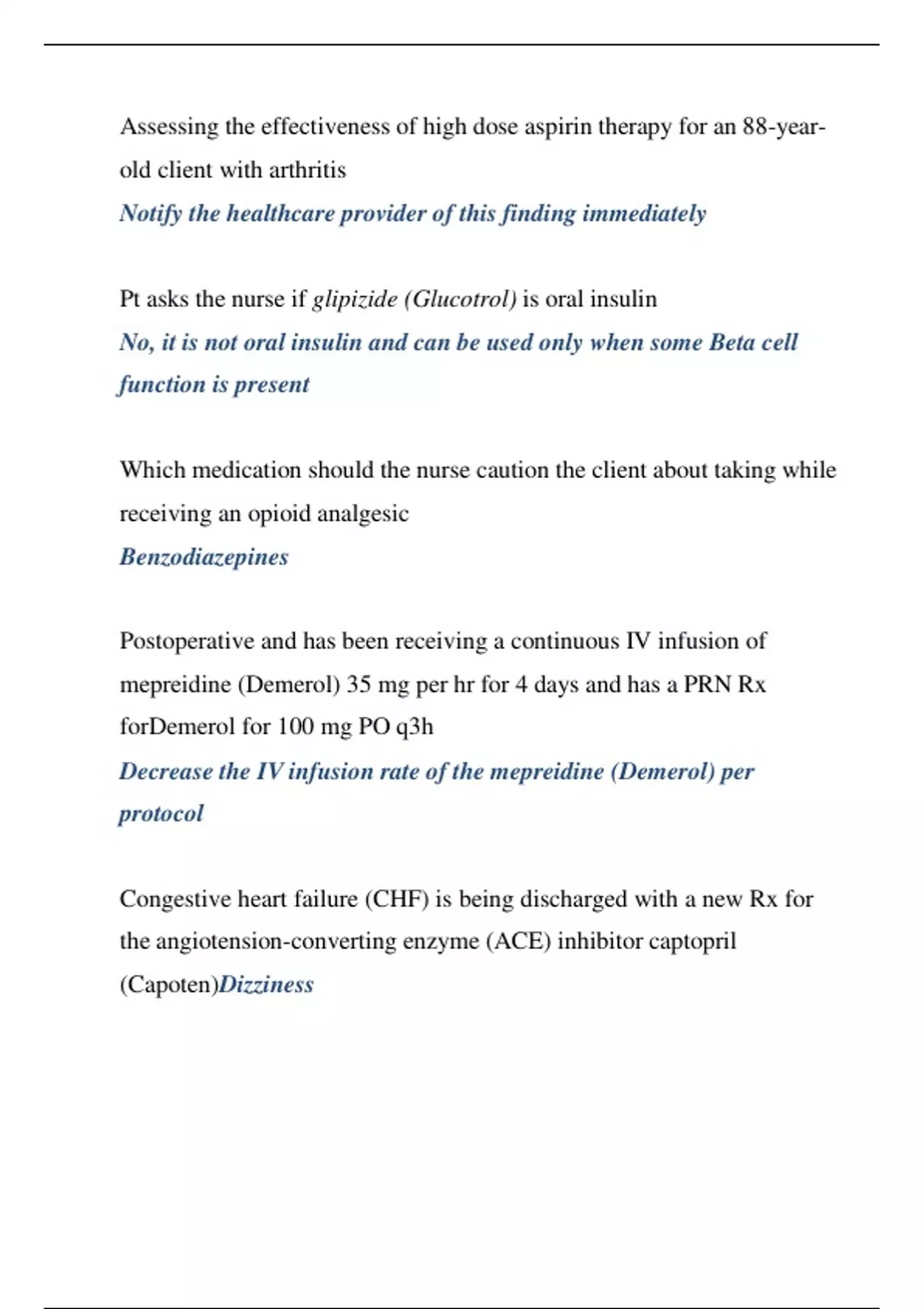 Assessing the effectiveness of high dose aspirin therapy for an 88-yearold client with arthritis Notify the healthcare provider of this finding immediately Pt asks the nurse if glipizide (Glucotrol) is oral insulin No, it is not oral insulin and can be used only when some Beta cell function is present Which medication should the nurse caution the client about taking while receiving an opioid analgesic Benzodiazepines Postoperative and has been receiving a continuous IV infusion of mepreidine (Demerol) 35 mg per hr for 4 days and has a PRN Rx for Demerol for 100 mg PO q3h Decrease the IV infusion rate of the mepreidine (Demerol) per protocol Congestive heart failure (CHF) is being discharged with a new Rx for the angiotension -converting enzyme (ACE) inhibitor captopril (Capoten)Dizziness Heparin Tx for a pulmonary embolism a client is being discharged with a Rx for warfarin (Coumadin) Prothrombin Time (PT/INR) Receiving metoprolol (Lopressor SR) Blood pressure Teaching for liver transplant about cyclosporine (Sand immune) the nurse should encourage the pt to report which adverse response Presence of hand tremors Older client with a decreased percentage of lean body receives a Rx that is adjusted based on which pharmacokinetic process? Distribution
