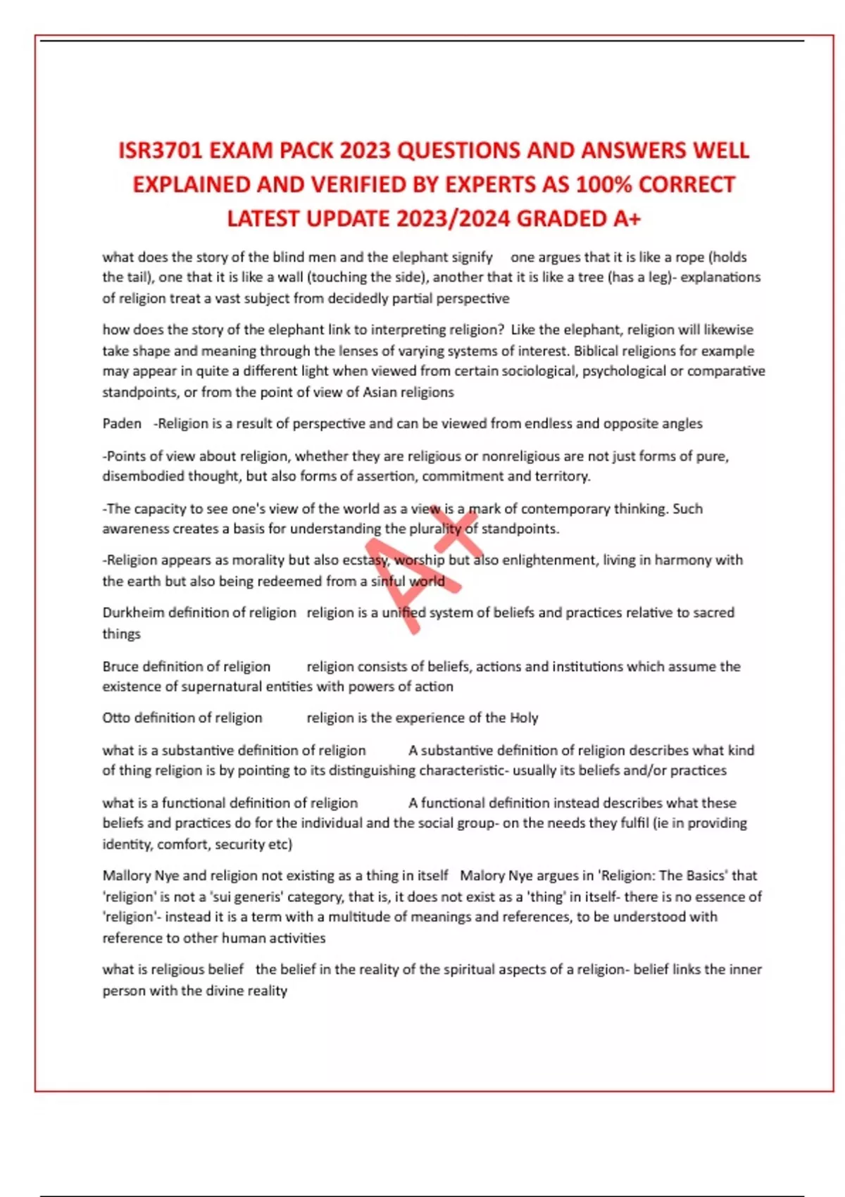 ISR3701 EXAM PACK 2023 QUESTIONS AND ANSWERS WELL EXPLAINED AND VERIFIED BY EXPERTS AS 100% CORRECT LATEST UPDATE 2023/2024 GRADED A+ what does the story of the blind men and the elephant signify one argues that it is like a rope (holds the tail), one that it is like a wall (touching the side), another that it is like a tree (has a leg)- explanations of religion treat a vast subject from decidedly partial perspective how does the story of the elephant link to interpreting religion? Like the elephant, religion will likewise take shape and meaning through the lenses of varying systems of interest. Biblical religions for example may appear in quite a different light when viewed from certain sociological, psychological or comparative standpoints, or from the point of view of Asian religions Paden -Religion is a result of perspective and can be viewed from endless and opposite angles -Points of view about religion, whether they are religious or nonreligious are not just forms of pure, disembodied thought, but also forms of assertion, commitment and territory. -The capacity to see one's view of the world as a view is a mark of contemporary thinking. Such awareness creates a basis for understanding the plurality of standpoints. -Religion appears as morality but also ecstasy, worship but also enlightenment, living in harmony with the earth but also being redeemed from a sinful world Durkheim definition of religion religion is a unified system of beliefs and practices relative to sacred things Bruce definition of religion religion consists of beliefs, actions and institutions which assume the existence of supernatural entities with powers of action Otto definition of religion religion is the experience of the Holy what is a substantive definition of religion A substantive definition of religion describes what kind of thing religion is by pointing to its distinguishing characteristi