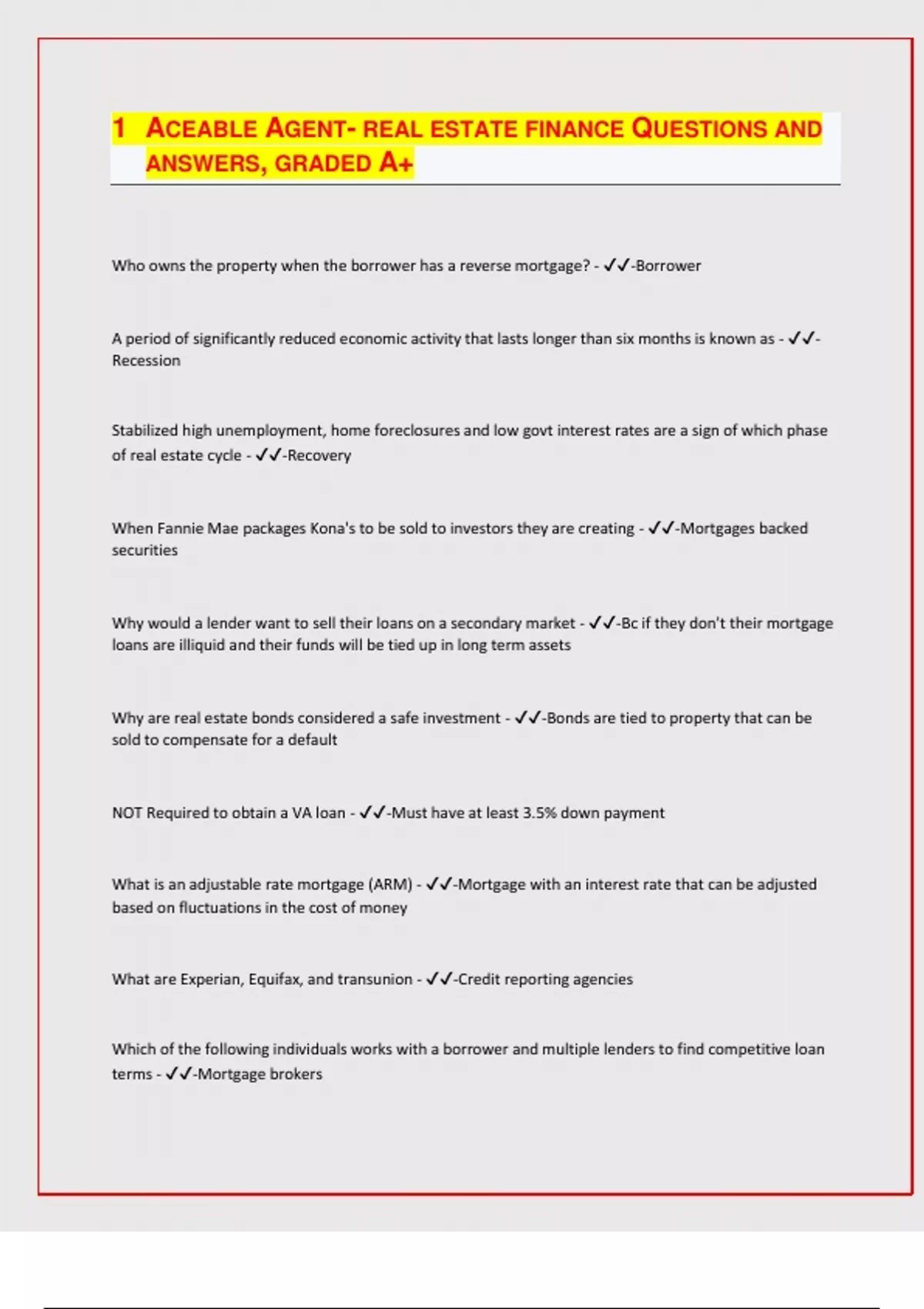 ACEABLE AGENT- REAL ESTATE FINANCE QUESTIONS AND ANSWERS, GRADED A+