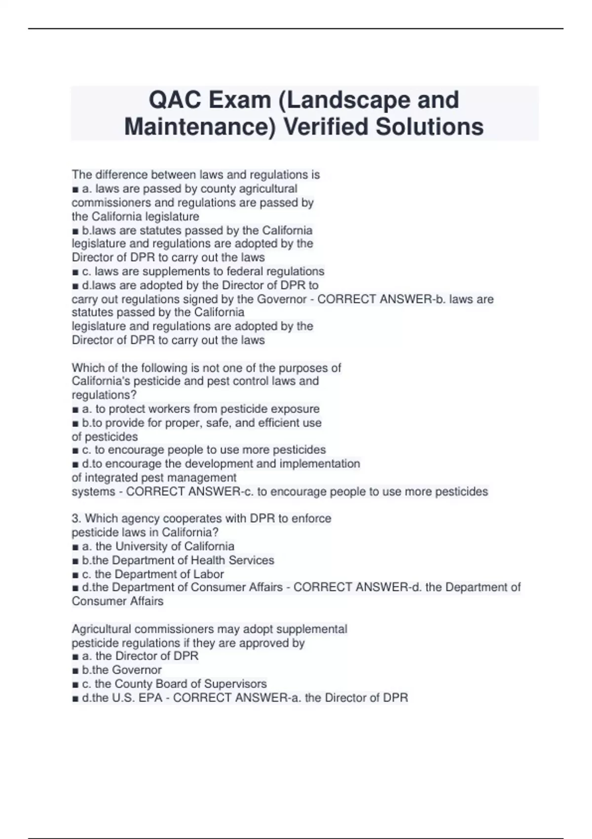 QAC Exam (Landscape and Maintenance) Verified Solutions The difference between laws and regulations is ■ a. laws are passed by county agricultural commissioners and regulations are passed by the California legislature ■ are statutes passed by the California legislature and regulations are adopted by the Director of DPR to carry out the laws ■ c. laws are supplements to federal regulations ■ are adopted by the Director of DPR to carry out regulations signed by the Governor - CORRECT ANSWER-b. laws are statutes passed by the California legislature and regulations are adopted by the Director of DPR to carry out the laws Which of the following is not one of the purposes of California's pesticide and pest control laws and regulations? ■ a. to protect workers from pesticide exposure ■ provide for proper, safe, and efficient use of pesticides ■ c. to encourage people to use more pesticides ■ encourage the development and implementation of integrated pest management systems - CORRECT ANSWER-c. to encourage people to use more pesticides 3. Which agency cooperates with DPR to enforce pesticide laws in California? ■ a. the University of California ■ Department of Health Services ■ c. the Department of Labor ■ Department of Consumer Affairs - CORRECT ANSWER-d. the Department of Consumer Affairs Agricultural commissioners may adopt supplemental pesticide regulations if they are approved by ■ a. the Director of DPR ■ Governor ■ c. the County Board of Supervisors ■ U.S. EPA - CORRECT ANSWER-a. the Director of DPR Which of the following could be considered part of a pesticide label? ■ a. a spray nozzle catalog ■ manufacturer's advertisement in a grower magazine ■ c. the Federal Worker Protection Standard ■ d.a written recommendation from a licensed Pest Control Adviser - CORRECT ANSWER-c. the Federal Worker Protection Standard When a manufacturer allows the registration of its pesticide product to lapse, pesticide dealers who sell this product ■ a. must immediately return all unsold product to the manufacture ■ lawfully sell and deliver the product for two years ■ c. must recall all of the product in the possession of end users ■ lawfully sell and deliver all remaining product for as many years as it takes - CORRECT