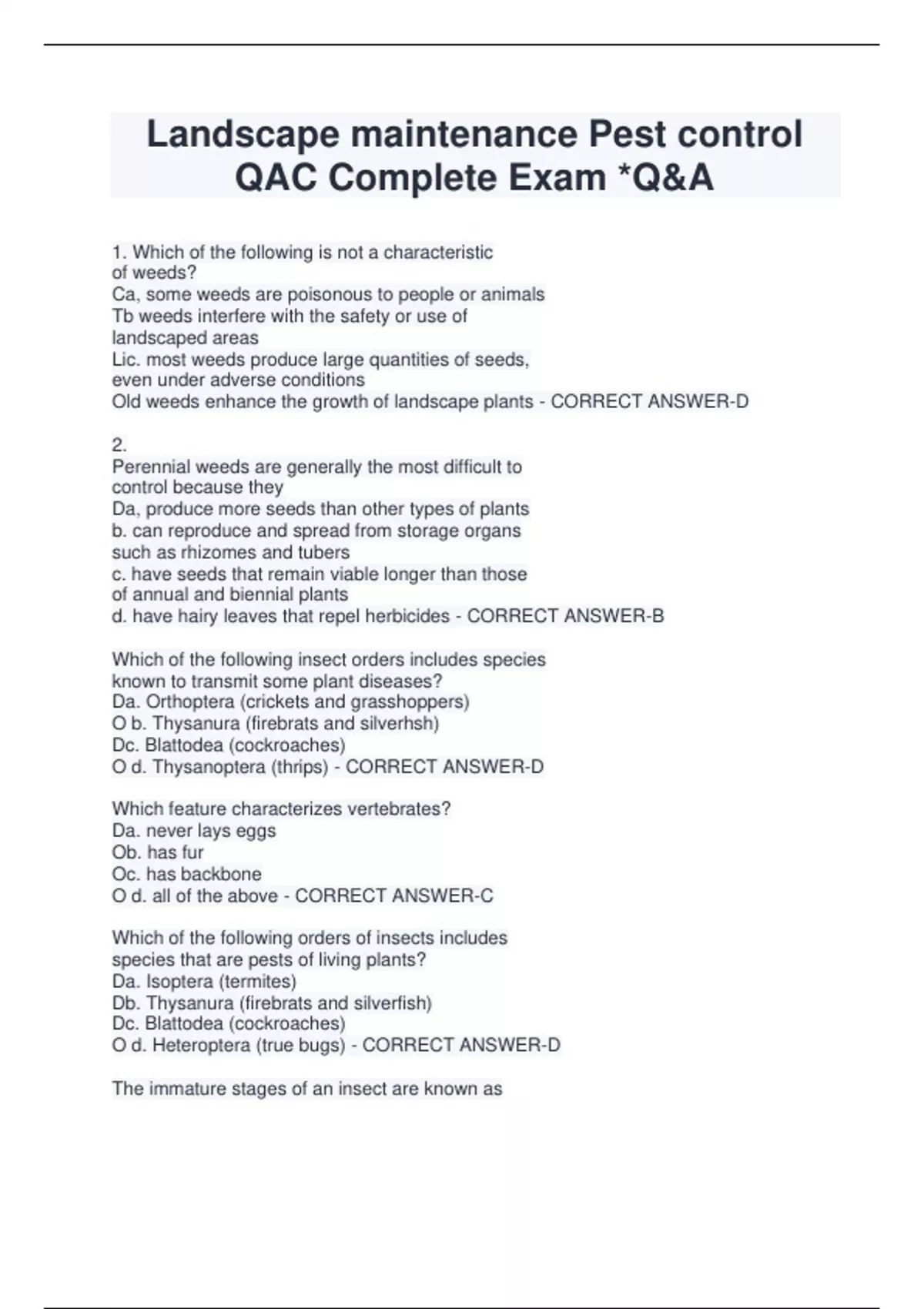Landscape maintenance Pest control QAC Complete Exam *Q&A 1. Which of the following is not a characteristic of weeds? Ca, some weeds are poisonous to people or animals Tb weeds interfere with the safety or use of landscaped areas Lic. most weeds produce large quantities of seeds, even under adverse conditions Old weeds enhance the growth of landscape plants - CORRECT ANSWER-D 2. Perennial weeds are generally the most difficult to control because they Da, produce more seeds than other types of plants b. can reproduce and spread from storage organs such as rhizomes and tubers c. have seeds that remain viable longer than those of annual and biennial plants d. have hairy leaves that repel herbicides - CORRECT ANSWER-B Which of the following insect orders includes species known to transmit some plant diseases? Da. Orthoptera (crickets and grasshoppers) O b. Thysanura (firebrats and silverhsh) Dc. Blattodea (cockroaches) O d. Thysanoptera (thrips) - CORRECT ANSWER-D Which feature characterizes vertebrates? Da. never lays eggs Ob. has fur Oc. has backbone O d. all of the above - CORRECT ANSWER-C Which of the following orders of insects includes species that are pests of living plants? Da. Isoptera (termites) Db. Thysanura (firebrats and silverfish) Dc. Blattodea (cockroaches) O d. Heteroptera (true bugs) - CORRECT ANSWER-D The immature stages of an insect are known as Oa. instars Ob. metamorphoses Oc. juveniles O-adults - CORRECT ANSWER-A Which of the following groups of insect orders include both pests and beneficials that attack pest insect species? Ca. Hymenoptera (wasps and bees), Thysanoptera (thrips), and Heteroptera (true bugs) 0b. Thysanura (firebrats and silverfish), Blattodea (cockroaches), and Dermaptera (earwigs) Cc. Isoptera (termites), Mallophaga (chewing lice), and Anoplura (sucking lice) Cd. Homoptera (aphids and whiteflies), Lepidoptera (moths and butterflies), and Siphonaptera (leas) - CORRECT ANSWER-A 8. Which of the fallowing insects suck plant juices out of plant cells? Da. Dermaptera (earwigs) Db. Homoptera (aphids and whiteNies) Dc. Lepidoptera (moths and butterflies) O d. Orthoptera (crickets and locusts - CORRECT ANSWER-B Which part of a plant do nematodes most common! attack? Da. fruit Db. roots and other underground plant parts Oc. germinating seeds Od. flowers - CORRECT ANSWER-B 10. Which of the following types of plant disorders cannot be transmitted trom plant to plant? Da. bacterial diseases Db. fungal diseases Dc. viruses Oic problems - CORRECT ANSWER-D 11. Ants belong to the insect order Da. Coleoptera Ob. Diptera Dc. Hymenoptera O d. Lepidoptera - CORRECT ANSWER-C 12. Which of the following insects have chewing mouth parts? Da. caterpillars O b. true bugs Ic. aphids Od. thrips - CORRECT ANSWER-A 13. Vertebrates include which of the following types of animals? Da. spiders and ticks Ob. snails and slugs Oc. birds and mice O d. butterflies and beetle - CORRECT ANSWER-C 14. Which of the following animals are arthropods? Da fish Ob. slugs Oc. rats Od. mites - CORRECT ANSWER-D 15. Which of the following pests would cause leaf stippling? Da. fungus disease Ob, beetle larvae Dc. mites O d. caterpillars - CORRECT ANSWER-C 16. An insect that passes through complete metamorphosis would have which of the following life stages? Da. egg, nymph, adult O, larva, adult Dc. egg, larva, nymph, adult O, larva, pupa, adult - CORRECT ANSWER-D 17. Powdery mildew on plants is caused by Da. insect feeding damage Db. fungus Dc. cultural practices Od. high temperatures - CORRECT ANSWER-B 18. An abiotic disorder of a plant can be caused by Ea. insects or mites Ob. fungal organisms Dc. irrigation problems - CORRECT ANSWER-C CHAPTER 2) - CORRECT ANSWEREfforts to completely eliminate a pest species ar