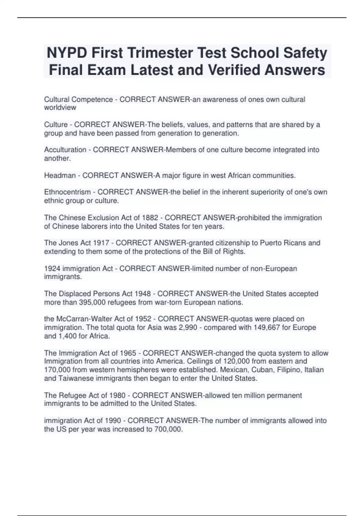 NYPD First Trimester Test School Safety Final Exam Latest and Verified Answers Cultural Competence - CORRECT ANSWER-an awareness of ones own cultural worldview Culture - CORRECT ANSWER-The beliefs, values, and patterns that are shared by a group and have been passed from generation to generation. Acculturation - CORRECT ANSWER-Members of one culture become integrated into another. Headman - CORRECT ANSWER-A major figure in west African communities. Ethnocentrism - CORRECT ANSWER-the belief in the inherent superiority of one's own ethnic group or culture. The Chinese Exclusion Act of 1882 - CORRECT ANSWER-prohibited the immigration of Chinese laborers into the United States for ten years. The Jones Act 1917 - CORRECT ANSWER-granted citizenship to Puerto Ricans and extending to them some of the protections of the Bill of Rights. 1924 immigration Act - CORRECT ANSWER-limited number of non-European immigrants. The Displaced Persons Act 1948 - CORRECT ANSWER-the United States accepted more than 395,000 refugees from war-torn European nations. the McCarran-Walter Act of 1952 - CORRECT ANSWER-quotas were placed on immigration. The total quota for Asia was 2,990 - compared with 149,667 for Europe and 1,400 for Africa. The Immigration Act of 1965 - CORRECT ANSWER-changed the quota system to allow Immigration from all countries into America. Ceilings of 120,000 from eastern and 170,000 from western hemispheres were established. Mexican, Cuban, Filipino, Italian and Taiwanese immigrants then began to enter the United States. The Refugee Act of 1980 - CORRECT ANSWER-allowed ten million permanent immigrants to be admitted to the United States. immigration Act of 1990 - CORRECT ANSWER-The number of immigrants allowed into the US per year was increased to 700,000