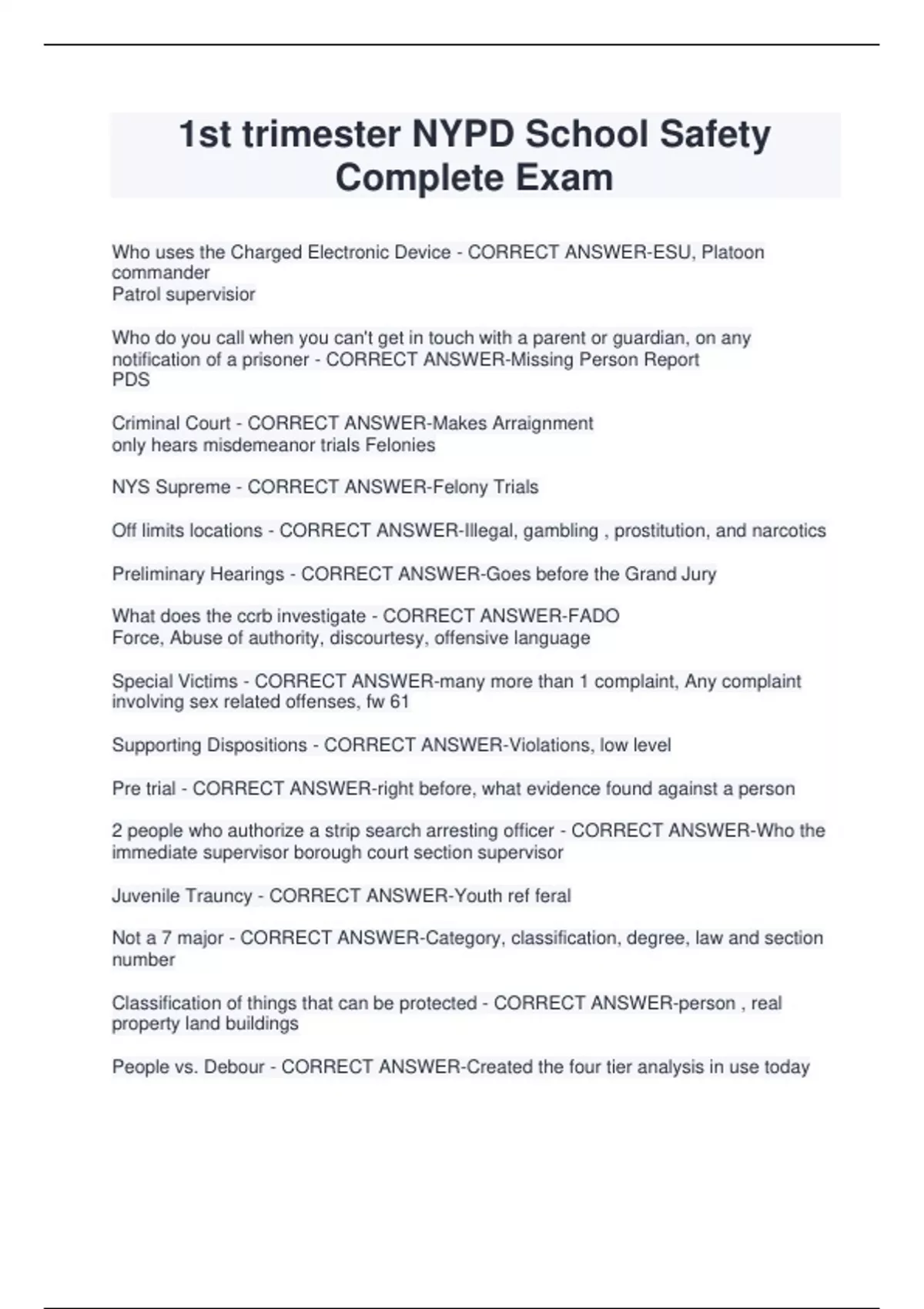 1st trimester NYPD School Safety Complete Exam Who uses the Charged Electronic Device - CORRECT ANSWER-ESU, Platoon commander Patrol supervisior Who do you call when you can't get in touch with a parent or guardian, on any notification of a prisoner - CORRECT ANSWER-Missing Person Report PDS Criminal Court - CORRECT ANSWER-Makes Arraignment only hears misdemeanor trials Felonies NYS Supreme - CORRECT ANSWER-Felony Trials Off limits locations - CORRECT ANSWER-Illegal, gambling , prostitution, and narcotics Preliminary Hearings - CORRECT ANSWER-Goes before the Grand Jury What does the ccrb investigate - CORRECT ANSWER-FADO Force, Abuse of authority, discourtesy, offensive language Special Victims - CORRECT ANSWER-many more than 1 complaint, Any complaint involving sex related offenses, fw 61 Supporting Dispositions - CORRECT ANSWER-Violations, low level Pre trial - CORRECT ANSWER-right before, what evidence found against a person 2 people who authorize a strip search arresting officer - CORRECT ANSWER-Who the immediate supervisor borough court section supervisor Juvenile Trauncy - CORRECT ANSWER-Youth ref feral Not a 7 major - CORRECT ANSWER-Category, classification, degree, law and section number Classification of things that can be protected - CORRECT ANSWER-person , real property land buildings People vs. Debour - CORRECT ANSWER-Created the four tier analysis in use today People vs. Mack - CORRECT ANSWER-Court ruled the frisk of a person is justified for violent crimes Terry vs. Ohio - CORRECT ANSWER-1968 U.S. supreme court addressed issue of search of a suspect on less than probable cause Precent Detective squad - CORRECT ANSWER-Modus Operandi- unique or unusual Burglary- when there is a person present -property taken valued over $5,000 -when a gun or safe involved in a home Robbery-when a gun or dangerous instrument is use