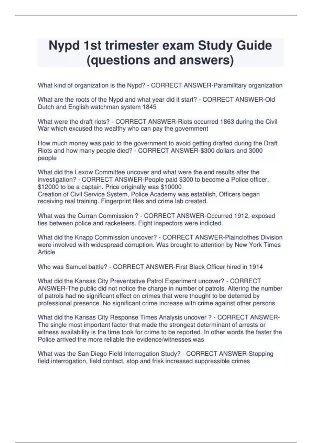 Nypd 1st trimester exam Study Guide (questions and answers) What kind of organization is the Nypd? - CORRECT ANSWER-Paramilitary organization What are the roots of the Nypd and what year did it start? - CORRECT ANSWER-Old Dutch and English watchman system 1845 What were the draft riots? - CORRECT ANSWER-Riots occurred 1863 during the Civil War which excused the wealthy who can pay the government How much money was paid to the government to avoid getting drafted during the Draft Riots and how many people died? - CORRECT ANSWER-$300 dollars and 3000 people What did the Lexow Committee uncover and what were the end results after the investigation? - CORRECT ANSWER-People paid $300 to become a Police officer, $12000 to be a captain. Price originally was $10000 Creation of Civil Service System, Police Academy was establish, Officers began receiving real training. Fingerprint files and crime lab created. What was the Curran Commission ? - CORRECT ANSWER-Occurred 1912, exposed ties between police and racketeers. Eight inspectors were indicted. What did the Knapp Commission uncover? - CORRECT ANSWER-Plainclothes Division were involved with widespread corruption. Was brought to attention by New York Times Article Who was Samuel battle? - CORRECT ANSWER-First Black Officer hired in 1914 What did the Kansas City Preventative Patrol Experiment uncover? - CORRECT ANSWER-The public did not notice the charge in number of patrols. Altering the number of patrols had no significant effect on crimes that were thought to be deterred by professional presence. No significant crime increase with crime against other persons What did the Kansas City Response Times Analysis uncover ? - CORRECT ANSWERThe single most important factor that made the strongest determinant of arrests or witness availability is the time took for crime to be reported. In other words the faster the Police arrived the more reliable the evidence/witnesses was What was the San Diego Field Interrogation Study? - CORRECT ANSWER-Stopping field interrogation, field contact, stop and frisk increased suppressible crimes What was the New Haven directed patrol study? - CORRECT ANSWER-Increase of patrols in a specific location did not win public favo