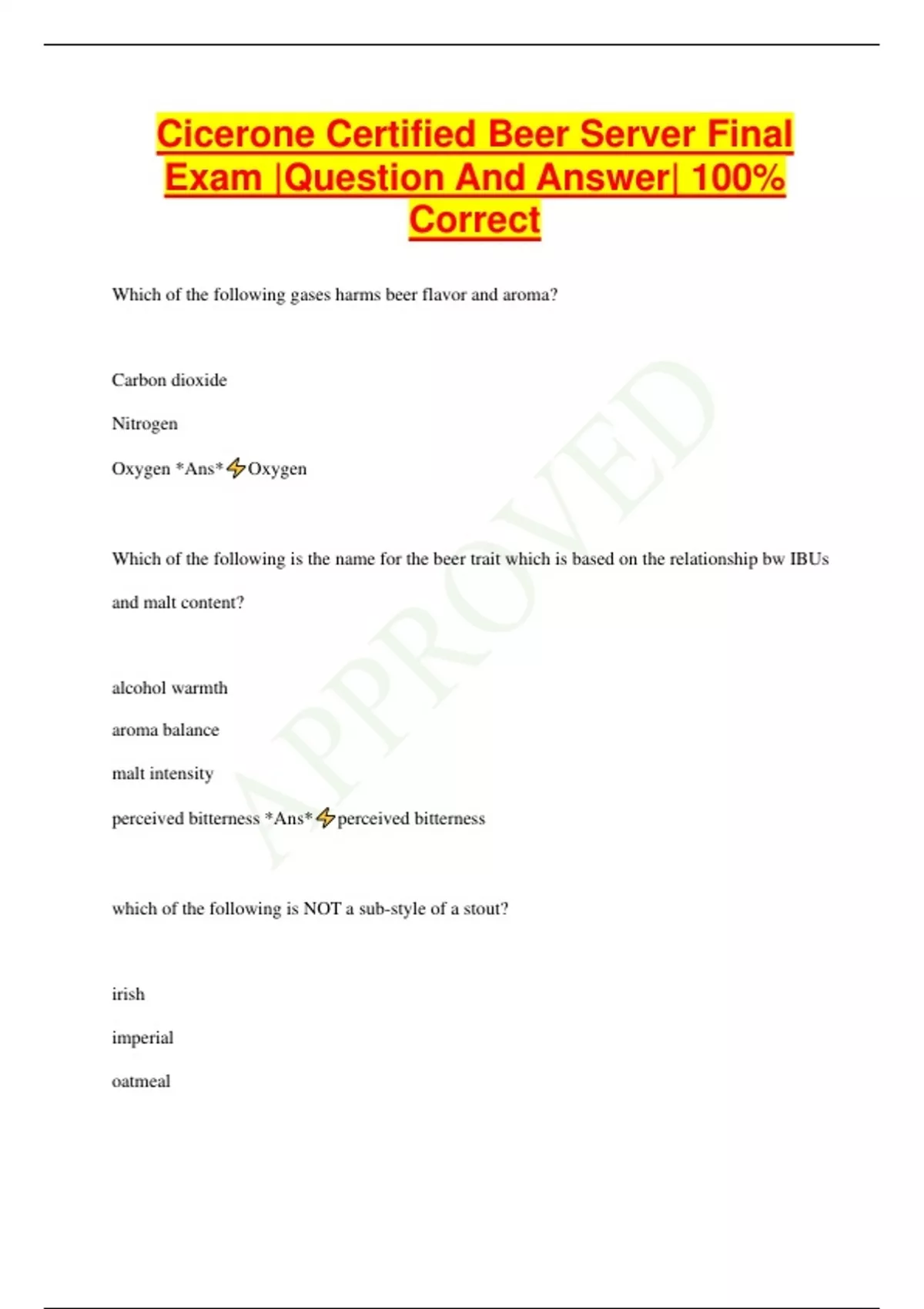 Cicerone Certified Beer Server Final Exam |Question And Answer| 100% Correct Which of the following gases harms beer flavor and aroma? Carbon dioxide Nitrogen Oxygen *Ans* Oxygen Which of the following is the name for the beer trait which is based on the relationship bw IBUs and malt content? alcohol warmth aroma balance malt intensity perceived bitterness *Ans* perceived bitterness which of the following is NOT a sub-style of a stout? irish imperial oatmeal scottish *Ans* scottish when assessing beer, why should the beer be poured into a glass rather than leaving it in the bottle? -allows aroma to be evaluated -ensures freshness of beer -helps beer maintain carbonation level -prevents lightstruck flavors from developing *Ans* allows aroma to be evaluated when you pick up a glass off the bar, what is the very first step in the cleaning process? -empty glass into open drain -rinse in cold water, heel in, heel out -rinse with cold water -wash with sudsless soap and brush *Ans* empty glass into open drain which of the following belgian beer styles is most likely to exhibit assertively sour, acidic flavors? dubbel flanders red ale saison witbier *Ans* flanders red ale which of the following is primarily a malt-derived flavor? caramel citrus green tea sugar beets *Ans* caramel what is the name for the part of a draft system that automatically stop the flow of beer when the keg empties? beer pump coupler faucet FOB *Ans* FOB Which of the following is the name of the scale by which alcohol content of beer is most commonly measured? *Ans* AB
