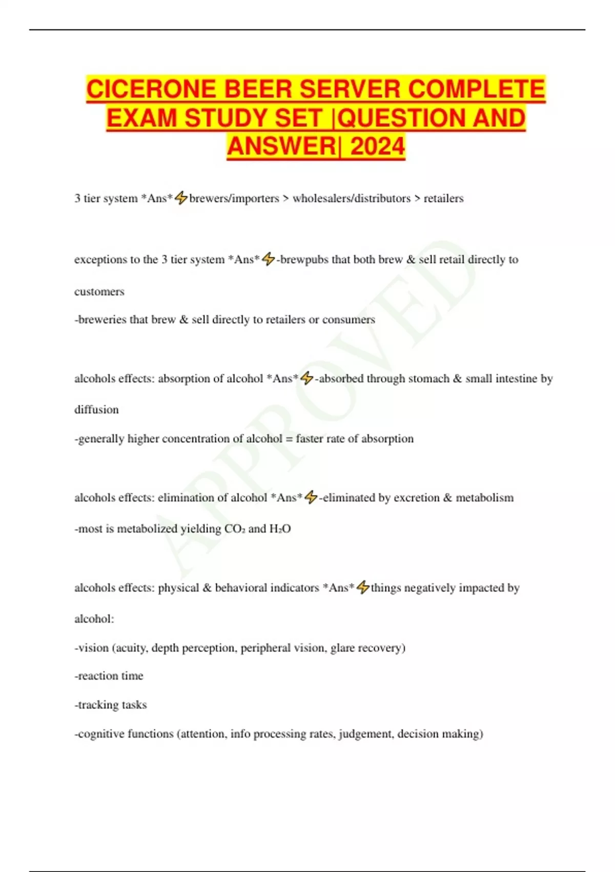 CICERONE BEER SERVER COMPLETE EXAM STUDY SET |QUESTION AND ANSWER| 2024 3 tier system *Ans* brewers/importers > wholesalers/distributors > retailers exceptions to the 3 tier system *Ans* -brewpubs that both brew & sell retail directly to customers -breweries that brew & sell directly to retailers or consumers alcohols effects: absorption of alcohol *Ans* -absorbed through stomach & small intestine by diffusion -generally higher concentration of alcohol = faster rate of absorption alcohols effects: elimination of alcohol *Ans* -eliminated by excretion & metabolism -most is metabolized yielding CO₂ and H₂O alcohols effects: physical & behavioral indicators *Ans* things negatively impacted by alcohol: -vision (acuity, depth perception, peripheral vision, glare recovery) -reaction time -tracking tasks -cognitive functions (attention, info processing rates, judgement, decision making) -psychomotor skills (coordination, body sway, manual dexterity) -other (memory, risk, overcompensating) responsible serving practices *Ans* -provide accurate ABV info to consumer -adjust serving size based on ABV -person must be 21y.o. with valid ID ABV *Ans* -alcohol by volume -standard measure of how much alcohol is contained in a given volume of alcoholic bev. adjusting serving size based on ABV *Ans* higher ABV → smaller serving size beer is best consumed ___________ *Ans* fresh when is beer ready to drink? *Ans* when it is released from the brewery exception to immediate freshness *Ans* a few strong/intensely flavored beers that have been properly aged/cellared ways to preserve freshness w/ wholesaler/retailer actions *Ans* -rotate inventory -store beer properly -serve beer properly maintaining fresh inventory *Ans* -ensure beer consumed in order of dating -remove out of date products -train staff to encourage/sell/promote all beers non-pasteurized (refrigerated) draft beer is good for approx _________ *Ans* 45-60 days pasteurized refrigerated draft beer is good for approx _________ *Ans* 90-120 days bottled refrigerated beer can be good for up to _________ *Ans* 6 months unrefrigerated/stressed beer may be off after ________ *Ans* 3 months how can you determine deterioration in bottled beer? *Ans* taste aged product against fresh what is the proper way to store beer? *Ans* refrigerated at all times non-refrigerated storage ________ & _________ *Ans* accelerated aging, development of o