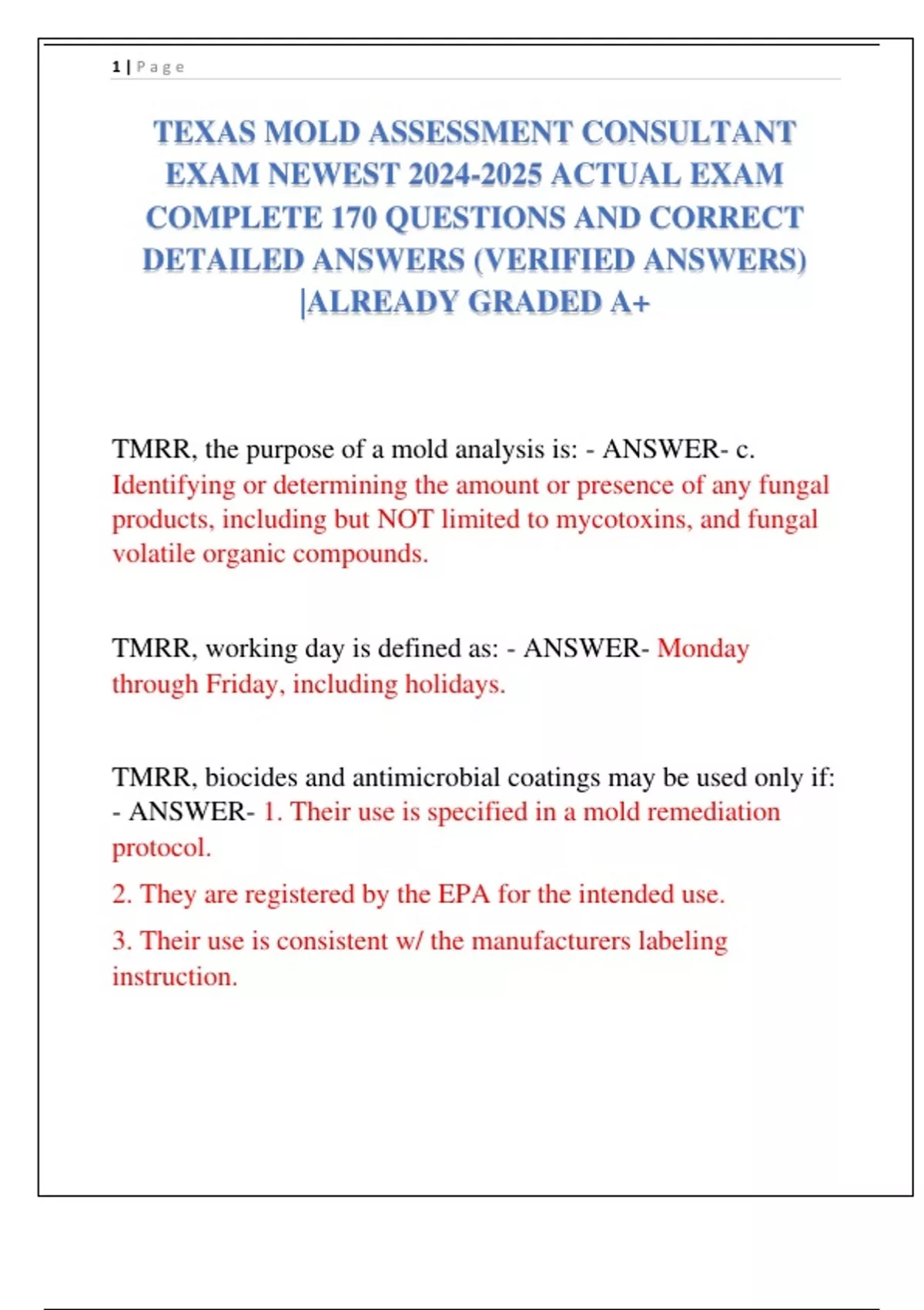 TEXAS MOLD ASSESSMENT CONSULTANT EXAM NEWEST ACTUAL EXAM COMPLETE 170 QUESTIONS AND CORRECT DETAILED ANSWERS (VERIFIED ANSWERS) |ALREADY GRADED A+