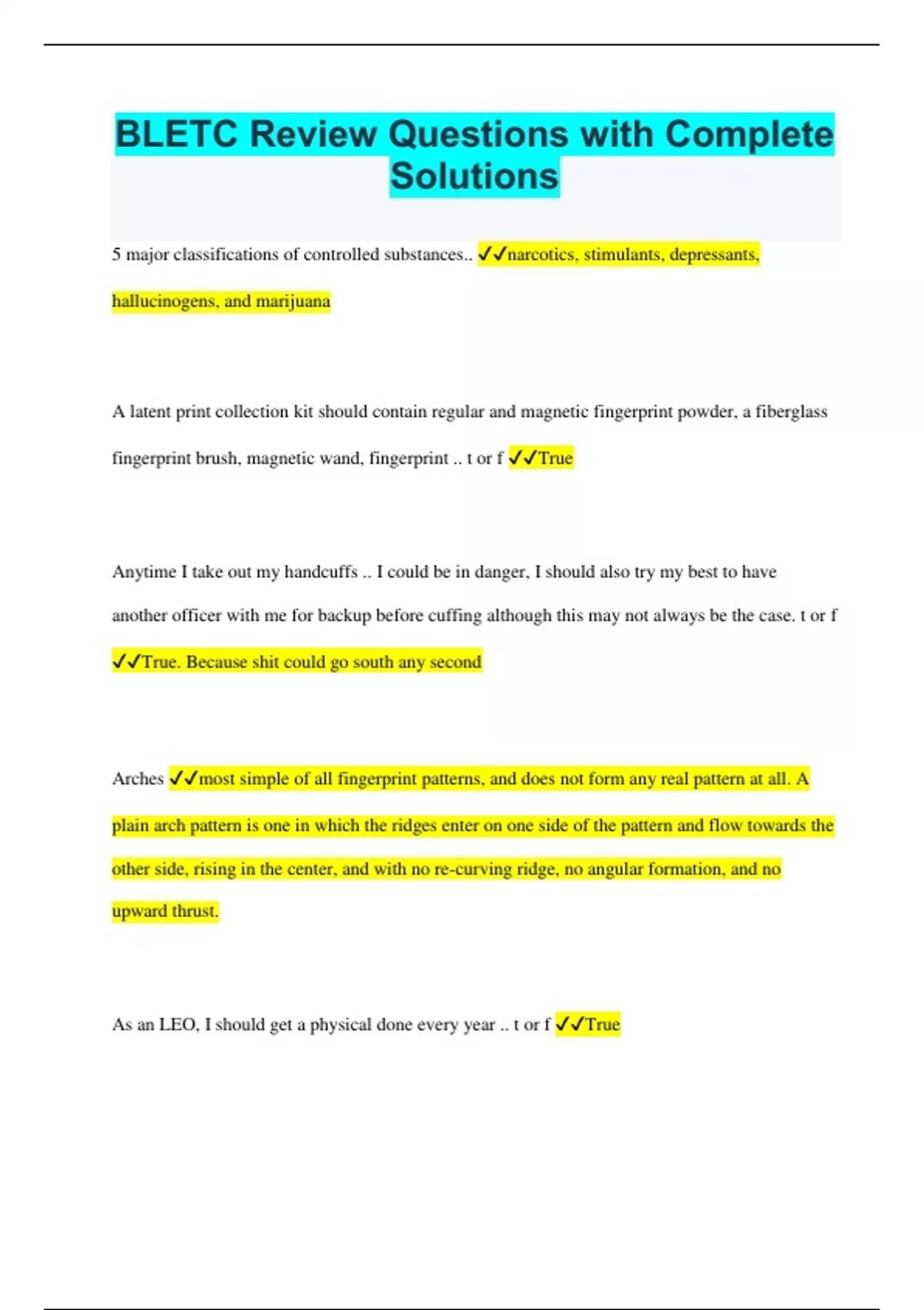 BLETC Review Questions with Complete Solutions 5 major classifications of controlled substances.. narcotics, stimulants, depressants, hallucinogens, and marijuana A latent print collection kit should contain regular and magnetic fingerprint powder, a fiberglass fingerprint brush, magnetic wand, fingerprint .. t or f True Anytime I take out my handcuffs .. I could be in danger, I should also try my best to have another officer with me for backup before cuffing although this may not always be the case. t or f True. Because shit could go south any second Arches most simple of all fingerprint patterns, and does not form any real pattern at all. A plain arch pattern is one in which the ridges enter on one side of the pattern and flow towards the other side, rising in the center, and with no re-curving ridge, no angular formation, and no upward thrust. As an LEO, I should get a physical done every year .. t or f True Criminal fingerprints are recorded on red-on-white fingerprint cards provided by the FBI. Blue- on-white fingerprint cards are used to print job applicants. t or f True Five outlaw motorcycle gangs identified by the FBI as posing a serious threat... hells angels, outlaws, the mongols, the sons of silence, and the bandidos Friction ridge.. raised portion of the skin of the print, consisting of one or more connected ridges GA controlled substance act 16-13-30 Heroin is derived from.. poppy plant how many points of contact should you have with the person before putting cuffs on them? 2 How many quadrants are there? 4 A B C D