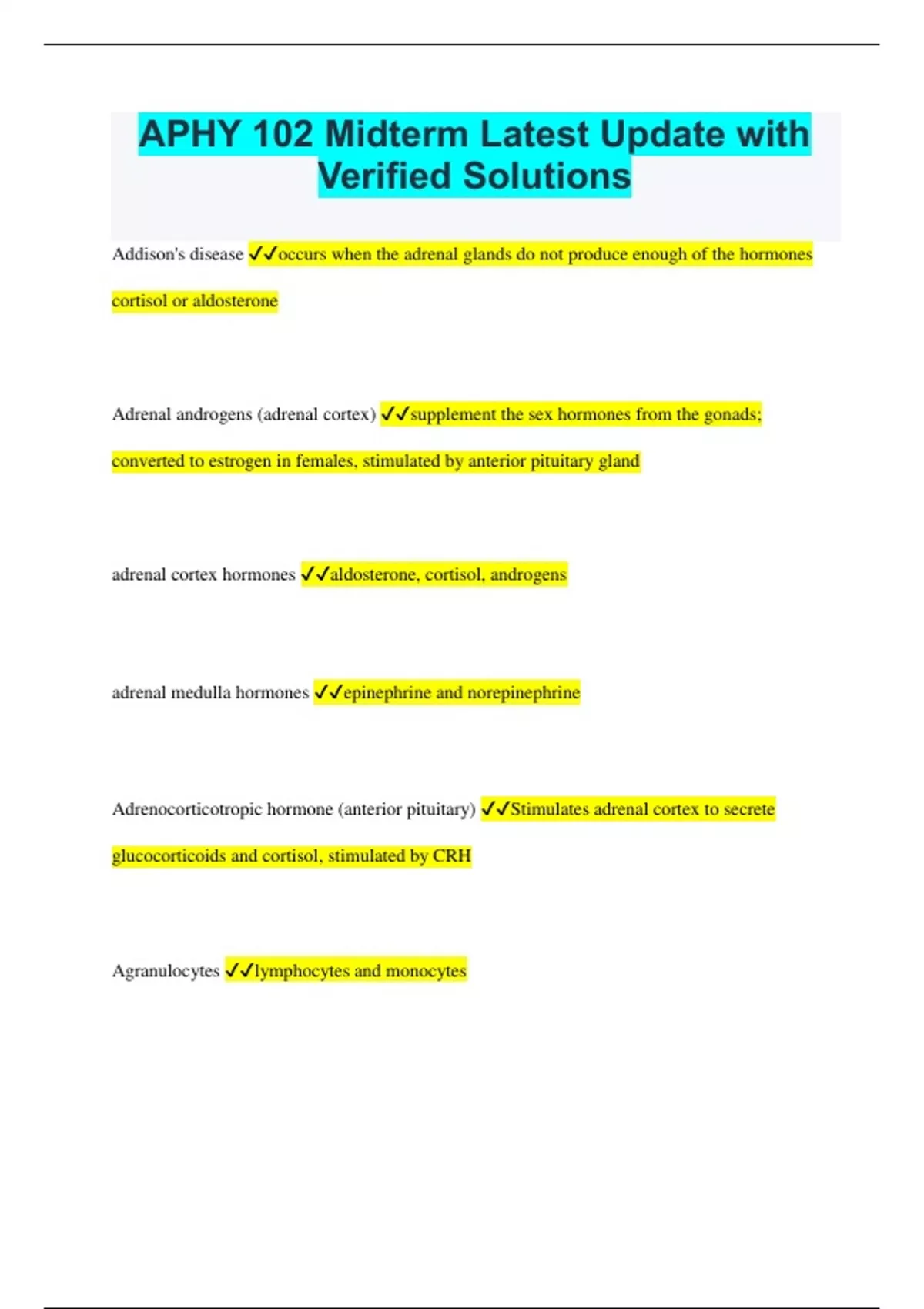 APHY 102 Midterm Latest Update with Verified Solutions Addison's disease occurs when the adrenal glands do not produce enough of the hormones cortisol or aldosterone Adrenal androgens (adrenal cortex) supplement the sex hormones from the gonads; converted to estrogen in females, stimulated by anterior pituitary gland adrenal cortex hormones aldosterone, cortisol, androgens adrenal medulla hormones epinephrine and norepinephrine Adrenocorticotropic hormone (anterior pituitary) Stimulates adrenal cortex to secrete glucocorticoids and cortisol, stimulated by CRH Agranulocytes lymphocytes and monocytes Aldosterone (adrenal cortex) regulates electrolytes (sodium and potassium) in kidneys, plasma K and Na allograft use of tissue from another person anterior pituitary hormones growth, prolactin, thyroid-stimulating, adrenocorticotropic, follicle-stimulating, leutinizing antidiuretic hormone (posterior pituitary) promotes retention of water by kidneys, hypothalamus antigen vs antibody Antigen: the foreign invader Antibody: what our body makes in response to the invader Arrythmias include fibrillaton, tachycardia, bradycardia, and atrial flutter At any given moment, where can blood be found in the body? veins atria in diastole, ventricles in systole ventricles contract, pushing blood into aorta Atrial Flutter irregular beating of the atria atrial natriuretic peptide (heart) helps to lower blood volume and decrease blood pressure by increasing excretion of sodium and water atrial systole and ventricular diastole atria contract, pushing blood into the ventricles autograft skin graft from a person's own body autoimmune disease a disease in which the immune system attacks the organism's own cells B cells Cells manufactured in the bone marrow that create antibodies for isolating and destroying invading bacteria and viruses.