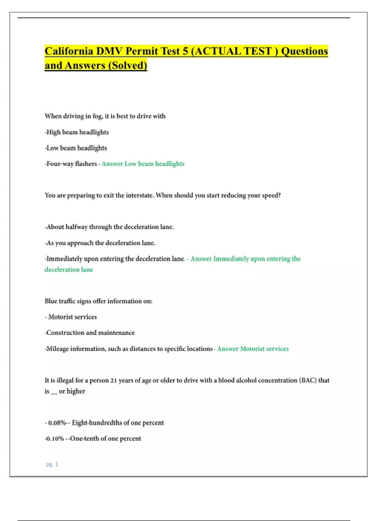 California DMV Permit Test 5 (ACTUAL TEST ) Questions and Answers (Solved)