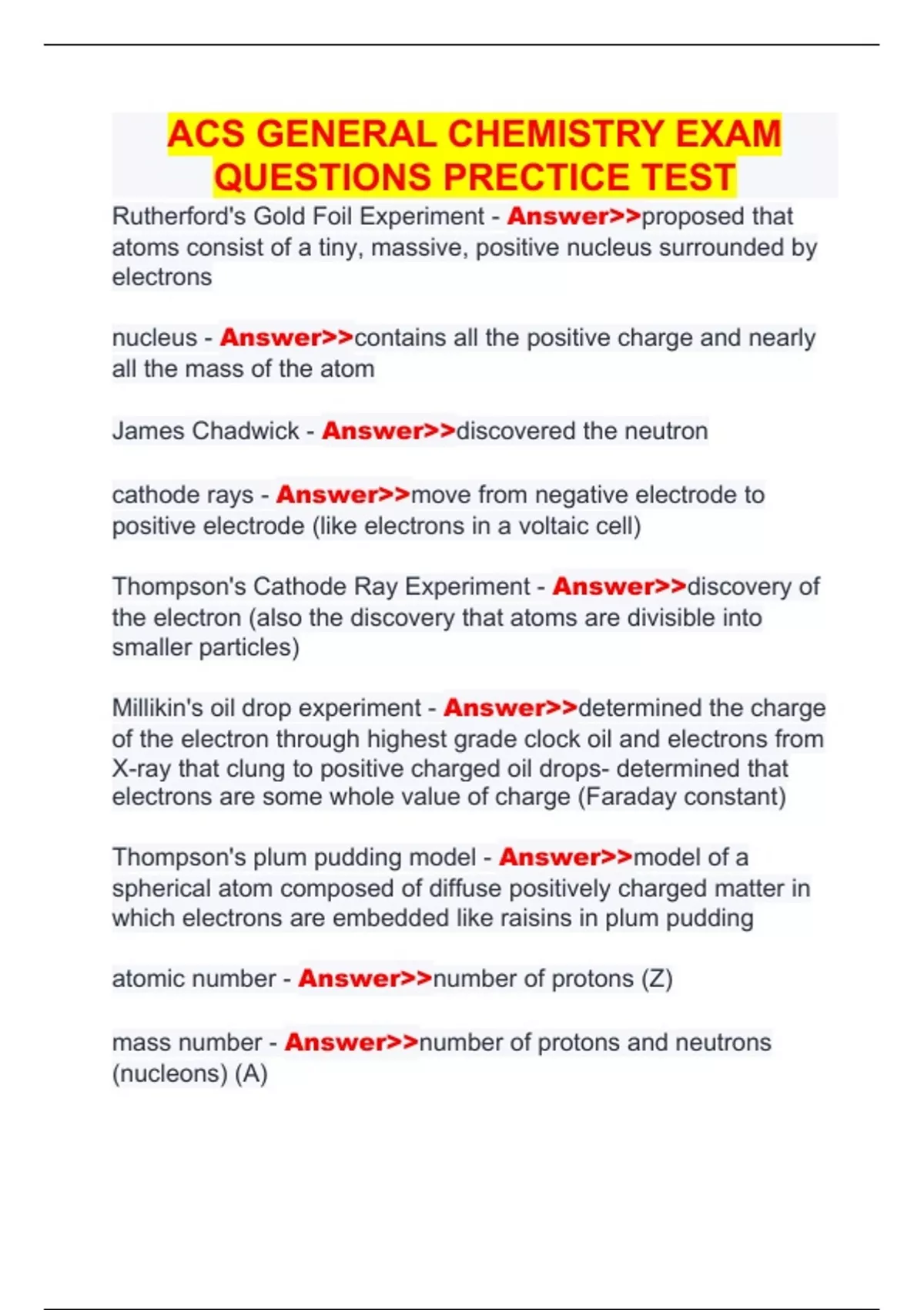 ACS GENERAL CHEMISTRY EXAM QUESTIONS PRECTICE TEST