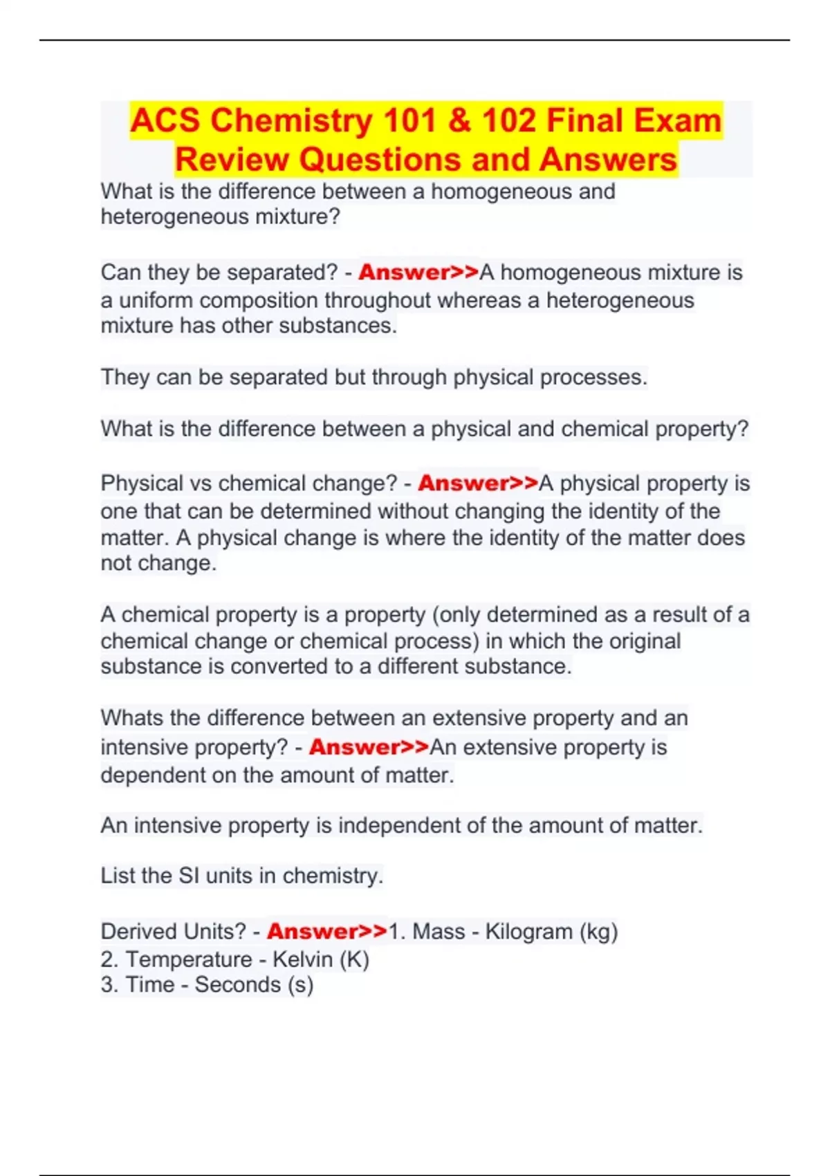 ACS Chemistry 101 & 102 Final Exam Review Questions and Answers