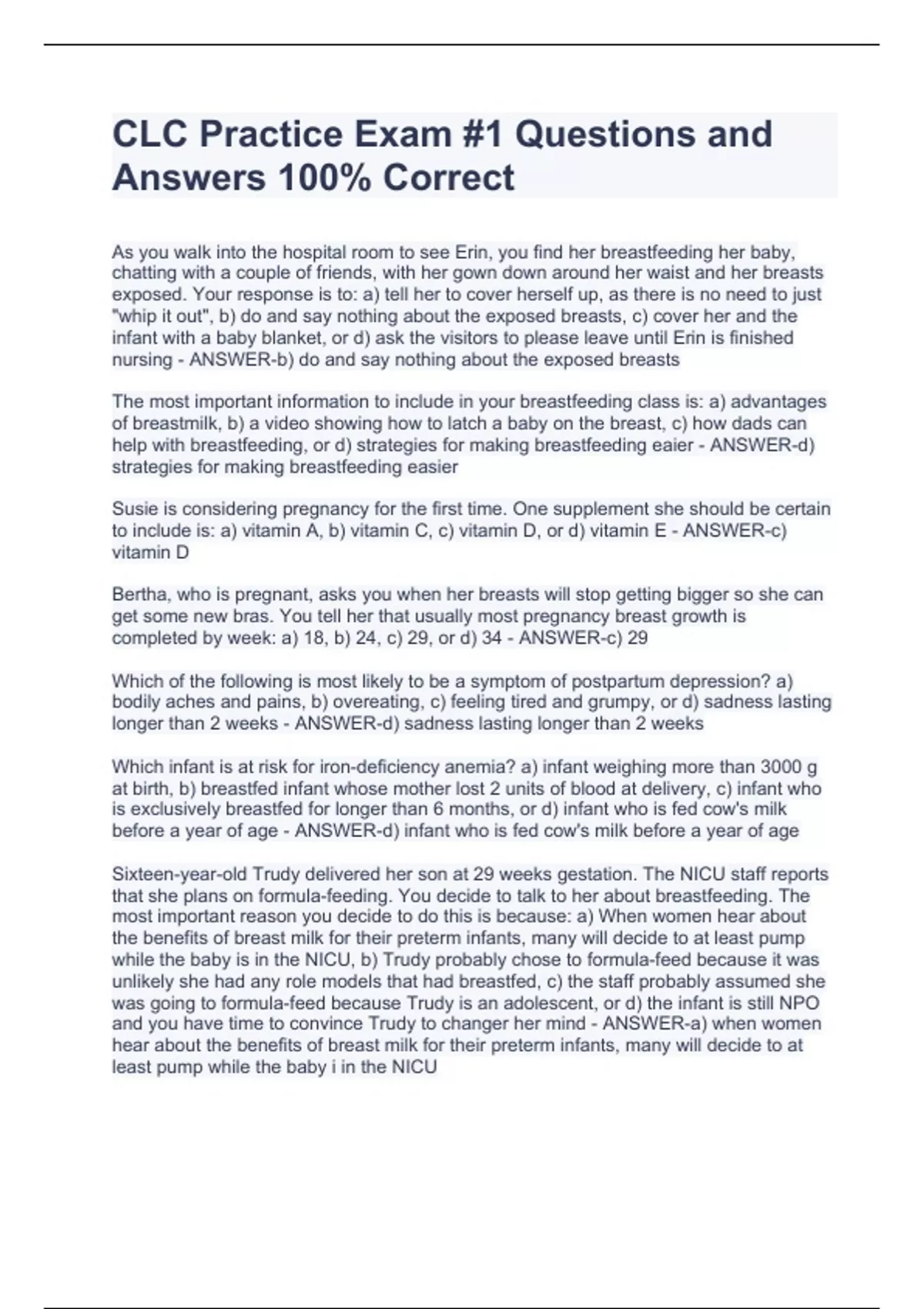 CLC Practice Exam #1 Questions and Answers 100% Correct CLC Practice Exam #1 Questions and Answers 100% Correct CLC Practice Exam #1 Questions and Answers 100% Correct CLC Practice Exam #1 Questions and Answers 100% Correct As you walk into the hospital room to see Erin, you find her breastfeeding her baby, chatting with a couple of friends, with her gown down around her waist and her breasts exposed. Your response is to: a) tell her to cover herself up, as there is no need to just "whip it out", b) do and say nothing about the exposed breasts, c) cover her and the infant with a baby blanket, or d) ask the visitors to please leave until Erin is finished nursing - ANSWER-b) do and say nothing about the exposed breasts The most important information to include in your breastfeeding class is: a) advantages of breastmilk, b) a video showing how to latch a baby on the breast, c) how dads can help with breastfeeding, or d) strategies for making breastfeeding eaier - ANSWER-d)