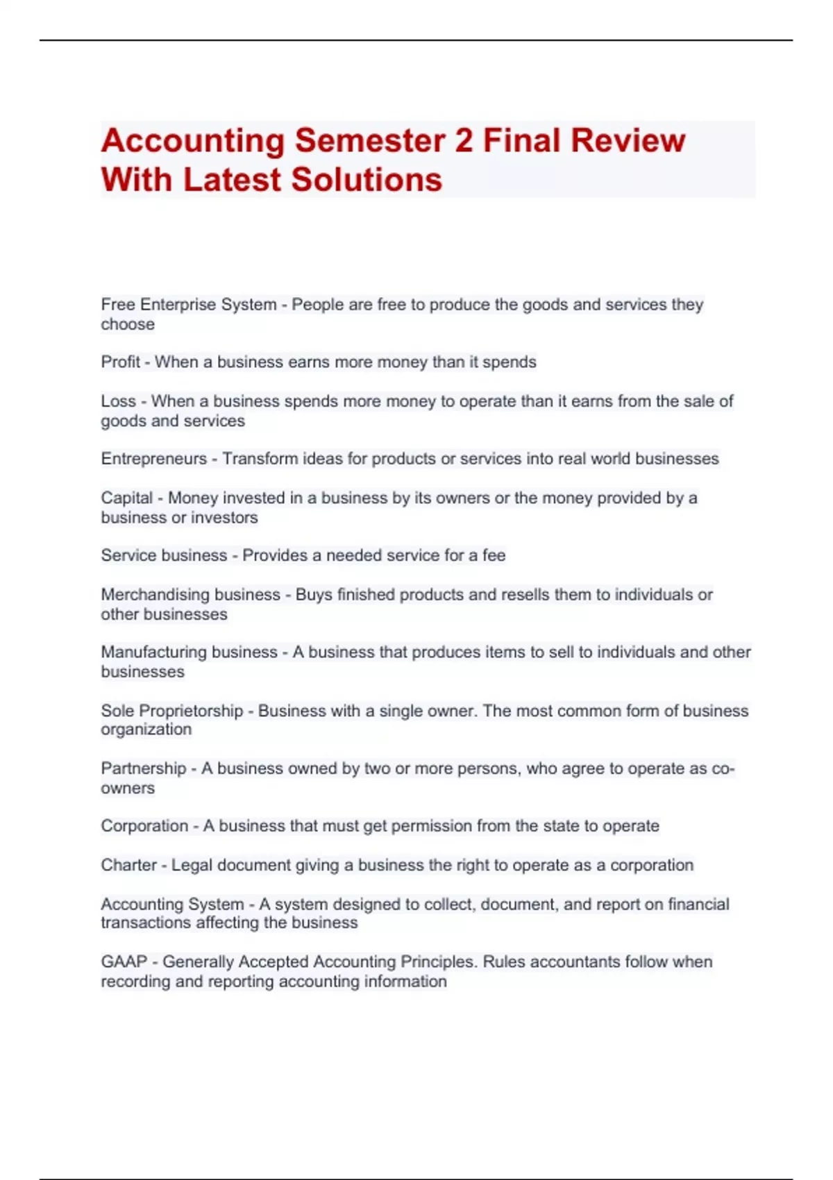 Free Enterprise System - People are free to produce the goods and services they choose Profit - When a business earns more money than it spends Loss - When a business spends more money to operate than it earns from the sale of goods and services Entrepreneurs - Transform ideas for products or services into real world businesses Capital - Money invested in a business by its owners or the money provided by a business or investors Service business - Provides a needed service for a fee Merchandising business - Buys finished products and resells them to individuals or other businesses Manufacturing business - A business that produces items to sell to individuals and other businesses Sole Proprietorship - Business with a single owner. The most common form of business organization Partnership - A business owned by two or more persons, who agree to operate as co-owners Corporation - A business that must get permission from the state to operate Charter - Legal document giving a business the right to operate as a corporation Accounting System - A system designed to collect, document, and report on financial transactions affecting the business GAAP - Generally Accepted Accounting Principles. Rules accountants follow when recording and reporting accounting information