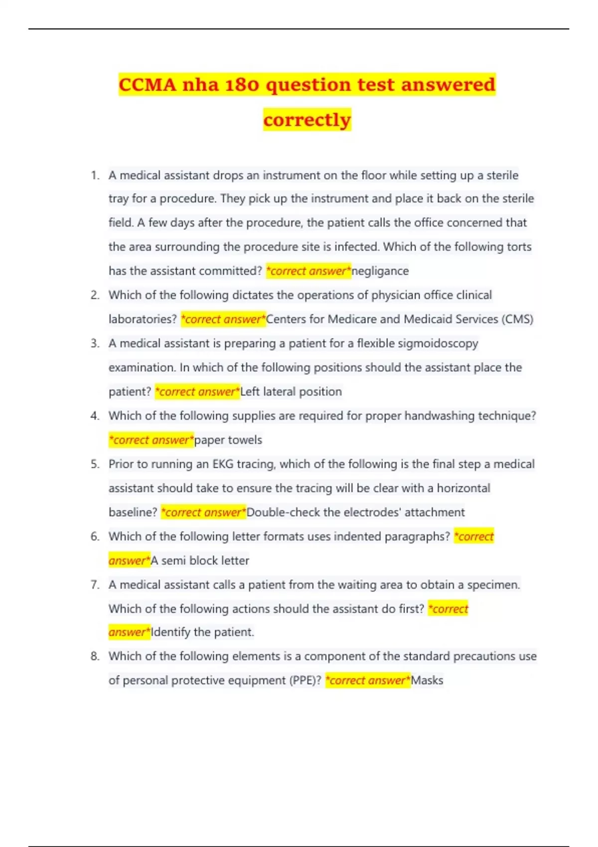CCMA nha 180 question test answered correctly 1. A medical assistant drops an instrument on the floor while setting up a sterile tray for a procedure. They pick up the instrument and place it back on the sterile field. A few days after the procedure, the patient calls the office concerned that the area surrounding the procedure site is infected. Which of the following torts has the assistant committed? *correct answer*negligance 2. Which of the following dictates the operations of physician office clinical laboratories? *correct answer*Centers for Medicare and Medicaid Services (CMS) 3. A medical assistant is preparing a patient for a flexible sigmoidoscopy examination. In which of the following positions should the assistant place the patient? *correct answer*Left lateral position