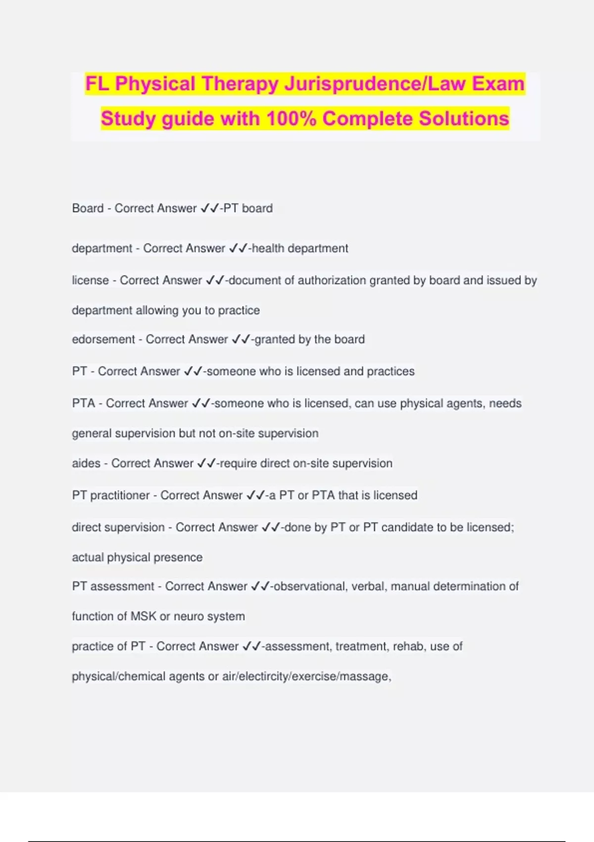 FL Physical Therapy Jurisprudence/Law Exam Study guide with 100% Complete Solutions Board - Correct Answer ️️ -PT board department - Correct Answer ️️ -health department license - Correct Answer ️️ -document of authorization granted by board and issued by department allowing you to practice edorsement - Correct Answer ️️ -granted by the board PT - Correct Answer ️️ -someone who is licensed and practices PTA - Correct Answer ️️ -someone who is licensed, can use physical agents, needs general supervision but not on-site supervision aides - Correct Answer ️️ -require direct on-site supervision PT practitioner - Correct Answer ️️ -a PT or PTA that is licensed direct supervision - Correct Answer ️️ -done by PT or PT candidate to be licensed; actual physical presence PT assessment - Correct Answer ️️ -observational, verbal, manual determination of function of MSK or neuro system practice of PT - Correct Answer ️️ -assessment, treatment, rehab, use of physical/chemical agents or air/electircity/exercise/massage,