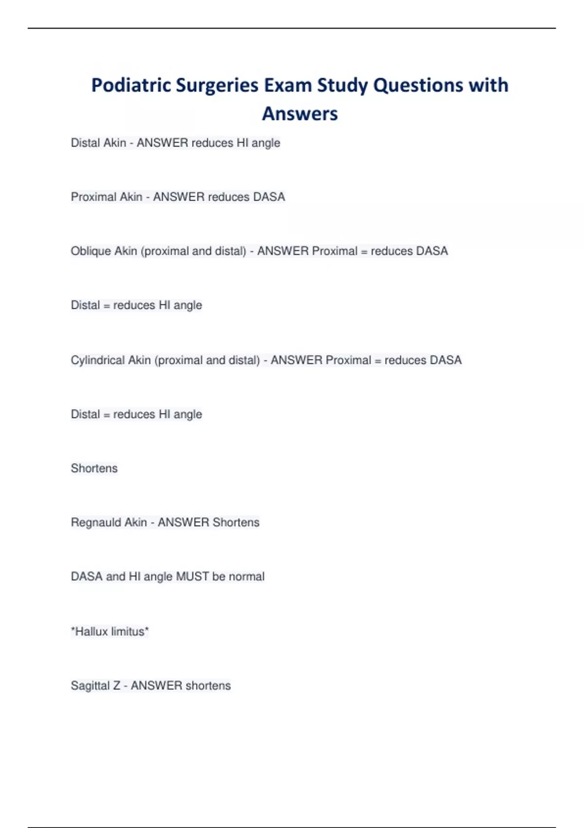 Distal Akin - ANSWER reduces HI angle Proximal Akin - ANSWER reduces DASA Oblique Akin (proximal and distal) - ANSWER Proximal = reduces DASA Distal = reduces HI angle Cylindrical Akin (proximal and distal) - ANSWER Proximal = reduces DASA Distal = reduces HI angle Shortens Regnauld Akin - ANSWER Shortens