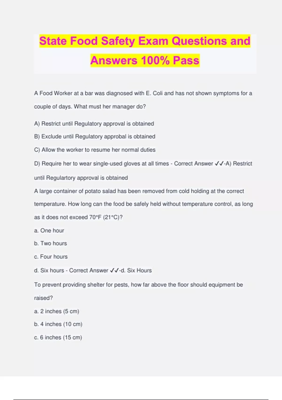State Food Safety Exam Questions and Answers 100% Pass A Food Worker at a bar was diagnosed with E. Coli and has not shown symptoms for a couple of days. What must her manager do? A) Restrict until Regulatory approval is obtained B) Exclude until Regulatory approbal is obtained C) Allow the worker to resume her normal duties D) Require her to wear single-used gloves at all times - Correct Answer ️️ -A) Restrict until Regulartory approval is obtained A large container of potato salad has been removed from cold holding at the correct temperature. How long can the food be safely held without temperature control, as long as it does not exceed 70°F (21°C)? a. One hour b. Two hours c. Four hours d. Six hours - Correct Answer ️️ -d. Six Hours To prevent providing shelter for pests, how far above the floor should equipment be raised? a. 2 inches (5 cm) b. 4 inches (10 cm) c. 6 inches (15 cm) d. 8 inches (20 cm) - Correct Answer ️️ -c. 6 inches (15 cm) At a minimum, how far must tabletop equipment be raised if it is not sealed to the counter? a. 2 inches (5 cm) b. 4 inches (10 cm) c. 6 inches (15 cm) d. 8 inches (20 cm) - Correct Answer ️️ -b. 4 inches (10 cm) Which symptom is a food worker required to report to his manager? a. A sore throat b. Stomach cramps c. Sensitivity to light d. An infected wound - Correct Answer ️️ -d. An infected wound A food worker needs to measure the temperature of a casserole. Where must the thermometer be placed when measuring this cooking temperature? a. In the middle of the casserole b. On the top of the food surface c. In several areas of the casserole d. On the edge of the casserole dish - Correct Answer ️️ -c. In several areas of the casserole What is a sign of a cockroach infestation? a. Gnaw marks b. Nesting materials c. Strong oily smells d. Strong smell of ammonia - Correct Answer ️️ -c. Strong oily smells Where can utensils be stored? a. Restrooms b. Locker rooms c. Mechanical rooms d. Food preparation areas - Correct Answer ️️ -d. Food preperation areas Which confirmed food worker illness must a manager report to the regulatory authority? a. Giardia b. Shigella c. Campylobacter d. Listeria monocytogenes - Correct Answer ️️ -b. Shigella A food worker is preparing eggs that will be hot held for service. What is the minimum internal temperature the eggs must reach for at least 15 seconds? a. 135°F (57°C) b. 145°F (63°C) c. 155°F (68°C) d. 165°F (74°C) - Correct Answer ️️ -c. 155°F (68°C) A food worker is monitoring a self-service station. What must she remind customers to do? a. Try the salad bar options b. Use clean dishes each time they get food c. Prevent children from serving themselves
