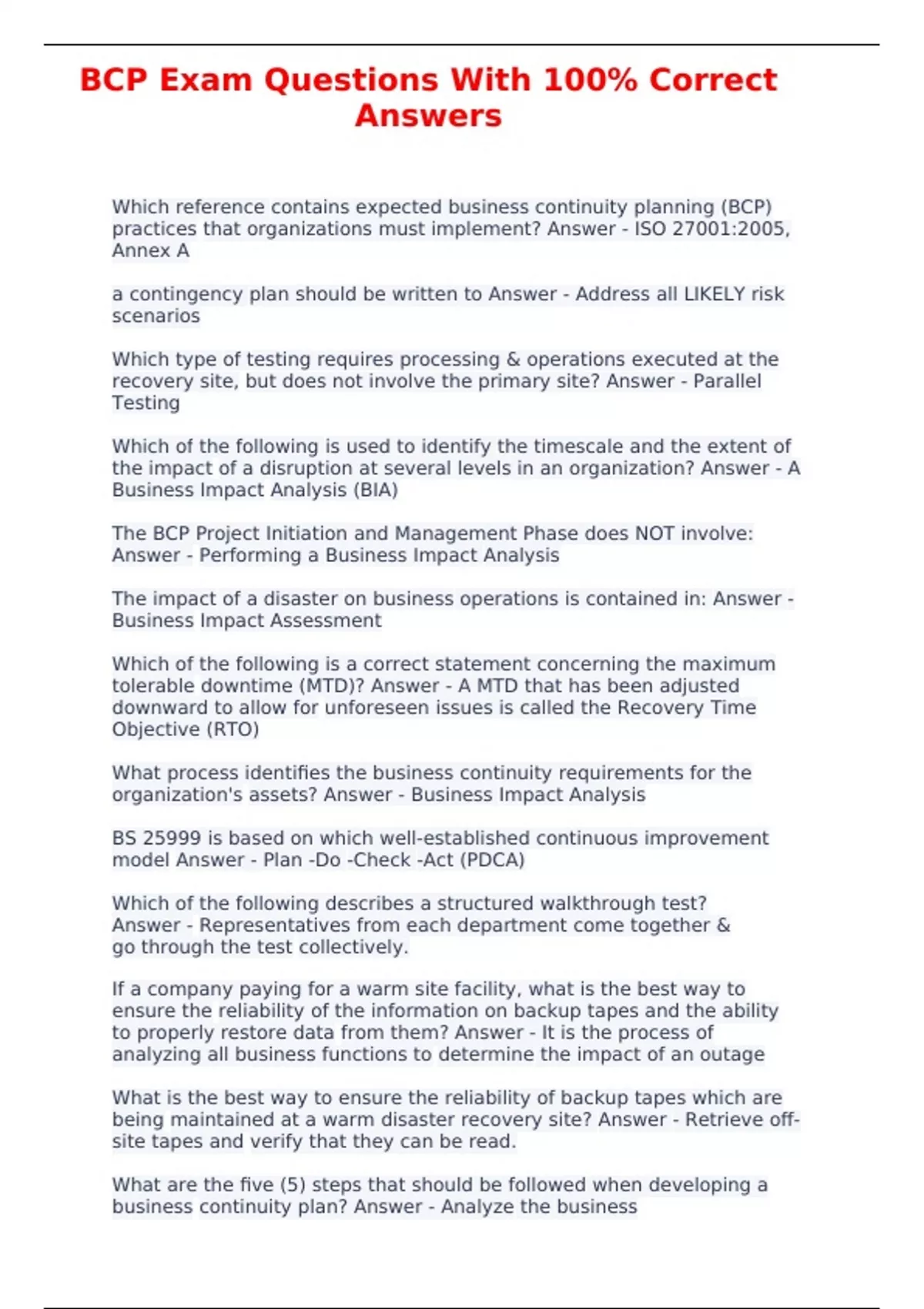 BCP Exam Questions With 100% Correct Answers Which reference contains expected business continuity planning (BCP) practices that organizations must implement? Answer - ISO 27001:2005, Annex A