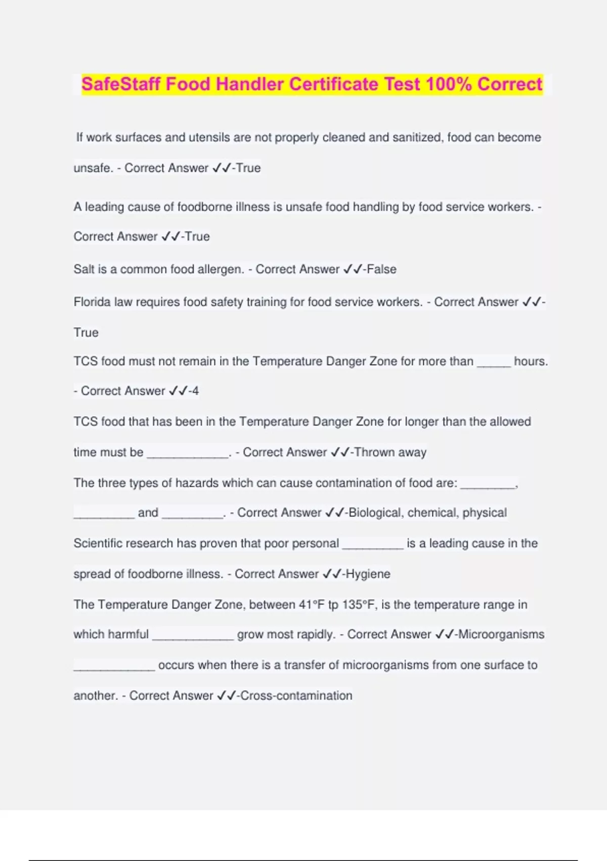 SafeStaff Food Handler Certificate Test 100% Correct If work surfaces and utensils are not properly cleaned and sanitized, food can become unsafe. - Correct Answer ️️ -True A leading cause of foodborne illness is unsafe food handling by food service workers. - Correct Answer ️️ -True Salt is a common food allergen. - Correct Answer ️️ -False Florida law requires food safety training for food service workers. - Correct Answer ️️ - True TCS food must not remain in the Temperature Danger Zone for more than _____ hours. - Correct Answer ️️ -4 TCS food that has been in the Temperature Danger Zone for longer than the allowed time must be ____________. - Correct Answer ️️ -Thrown away The three types of hazards which can cause contamination of food are: ________, _________ and _________. - Correct Answer ️️ -Biological, chemical, physical Scientific research has proven that poor personal _________ is a leading cause in the spread of foodborne illness. - Correct Answer ️️ -Hygiene The Temperature Danger Zone, between 41°F tp 135°F, is the temperature range in which harmful ____________ grow most rapidly. - Correct Answer ️️ -Microorganisms ____________ occurs when there is a transfer of microorganisms from one surface to another. - Correct Answer ️️ -Cross-contamination When preparing food, work in _________ batches to ____________ the time food spends in the Temperature Danger Zone. - Correct Answer ️️ -Small, minimize ________________ is an extremely important factor in preventing contamination when preparing and serving food. - Correct Answer ️️ -Proper handwashing A foodborne illness is a disease caused when people eat contaminated food. - Correct Answer ️️ -True Wheat is a common food allergen. - Correct Answer ️️ -True "Excluded" employees may return to work as soon as they feel better. - Correct Answer ️️ -False Employees have a legal responsibility to notify their supervisor when ill. - Correct Answer ️️ -True A potentially hazardous or ______ food is capable of supporting the rapid growth of harmful microorganisms. - Correct Answer ️️ -TCS ____________ illnesses are commonly caused by poor personal hygiene behaviors. - Correct Answer ️️ -Foodborne Employees must report certain diagnosed illnesses and certain symptoms of illness to their __________. - Correct Answer ️️ -Manager Microorganisms capable of causing foodborne illness include: virus, fungi, parasites and __________. - Correct Answer ️️ -Bacteria Which of the following is not a type of microorganism? - Correct Answer ️️ -Acidity Which of the following is the acronym used to remember the conditions in which microorganisms grow best? - Correct Answer ️️ -FAT TOM Which of the following illnesses result in a food employee being "excluded" from work? - Correct Answer ️️ -All of the above (Salmonellosis, E. Coli, Hepatitis A.) Employees must report which of the following symptoms of illness to his or her manager: - Correct Answer ️️ -Sore throat with fever. Employees may eat a meal and cook for customers at the same time. - Correct Answer ️️ -False Employees should wash hands in the nearest prep sink. - Correct Answer ️️ -False