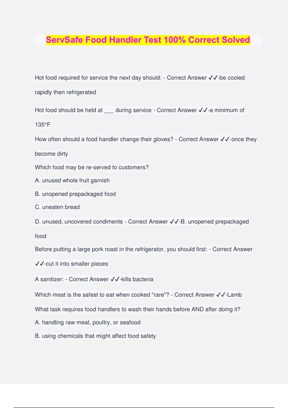 ServSafe Food Handler Test 100% Correct Solved Hot food required for service the next day should: - Correct Answer ️️ -be cooled rapidly then refrigerated Hot food should be held at ___ during service - Correct Answer ️️ -a minimum of 135°F How often should a food handler change their gloves? - Correct Answer ️️ -once they become dirty Which food may be re-served to customers? A. unused whole fruit garnish B. unopened prepackaged food C. uneaten bread D. unused, uncovered condiments - Correct Answer ️️ -B. unopened prepackaged food Before putting a large pork roast in the refrigerator, you should first: - Correct Answer ️️ -cut it into smaller pieces A sanitizer: - Correct Answer ️️ -kills bacteria Which meat is the safest to eat when cooked "rare"? - Correct Answer ️️ -Lamb What task requires food handlers to wash their hands before AND after doing it? A. handling raw meat, poultry, or seafood B. using chemicals that might affect food safety C. taking out garbage D. touching clothing or aprons - Correct Answer ️️ -A. handling raw meat, poultry, or seafood When storing food in the fridge or freezer, you should: A. rotate stock - first in, first out rule B. record the temperature of the fridge and/or freezer daily C. cover, label & date foods D. all of these - Correct Answer ️️ -D. all of these Why shouldn't you mix cooked and raw foods? - Correct Answer ️️ -it results in a "cross-contamination" What are the basic steps for cleaning effectively? - Correct Answer ️️ -Scraping, clean with detergent, sanitizing and air drying What does bacteria need to multiply? - Correct Answer ️️ -food, water, and warm temperatures Which is a TCS food? A. saltines B. bananas C. coffee D. baked potato - Correct Answer ️️ -D. baked potato Who is responsible for safe food handling in the food premises? - Correct Answer ️️ - owner, head chef, and anyone handling food A detergent: - Correct Answer ️️ -helps remove visible soil Which food probably contains the most bacteria? A. hamburger cooked rare B. frozen raw chicken C. opened jar of mayonnaise D. a stale slice of bread - Correct Answer ️️ -B. frozen raw chicken How can you tell if food has enough bacteria to cause food poisoning? - Correct Answer ️️ -You can't tell. It smells, tastes and looks normal. What food safety practice can prevent cross-contact? - Correct Answer ️️ -washing, rinsing, and sanitizing utensils before each use Foods not likely to support bacterial growth are:
