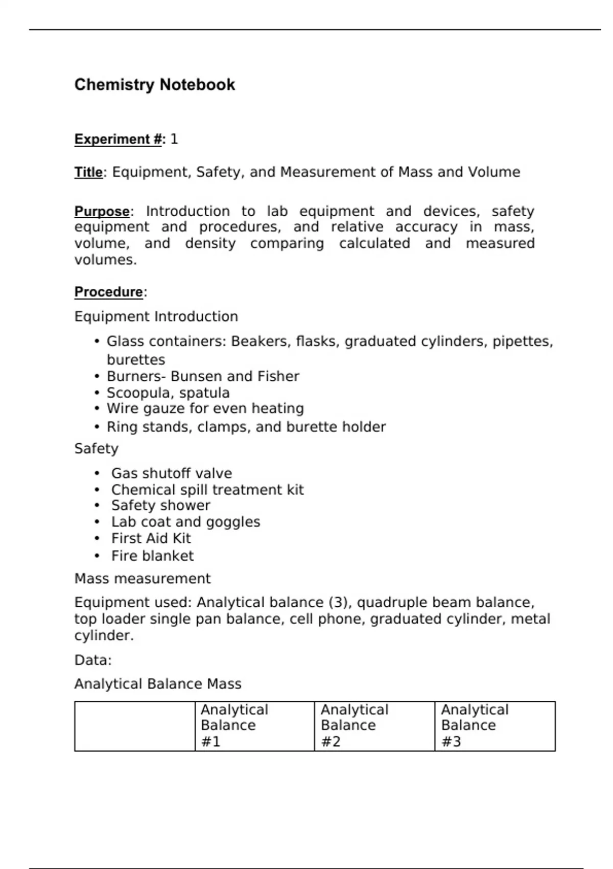 Experiment #: 1 Title: Equipment, Safety, and Measurement of Mass and Volume Purpose: Introduction to lab equipment and devices, safety equipment and procedures, and relative accuracy in mass, volume, and density comparing calculated and measured volumes. Procedure: Equipment Introduction Glass containers: Beakers, flasks, graduated cylinders, pipettes, burettes Burners- Bunsen and Fisher Scoopula, spatula Wire gauze for even heating Ring stands, clamps, and burette holder