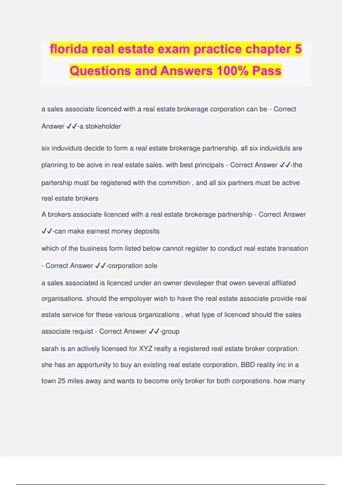florida real estate exam practice chapter 5 Questions and Answers 100% Pass a sales associate licenced with a real estate brokerage corporation can be - Correct Answer ️️ -a stokeholder six induviduls decide to form a real estate brokerage partnership. all six induviduls are planning to be acive in real estate sales. with best principals - Correct Answer ️️ -the partership must be registered with the commition , and all six partners must be active real estate brokers A brokers associate licenced with a real estate brokerage partnership - Correct Answer ️️ -can make earnest money deposits which of the business form listed below cannot register to conduct real estate transation - Correct Answer ️️ -corporation sole a sales associated is licenced under an owner devoleper that owen several affliated organisations. should the empoloyer wish to have the real estate associate provide real estate service for these various organizations , what type of licenced should the sales associate requist - Correct Answer ️️ -group sarah is an actively licensed for XYZ realty a registered real estate broker corpration. she has an apportunity to buy an existing real estate corporation, BBD reality inc in a town 25 miles away and wants to become only broker for both corporations. how many