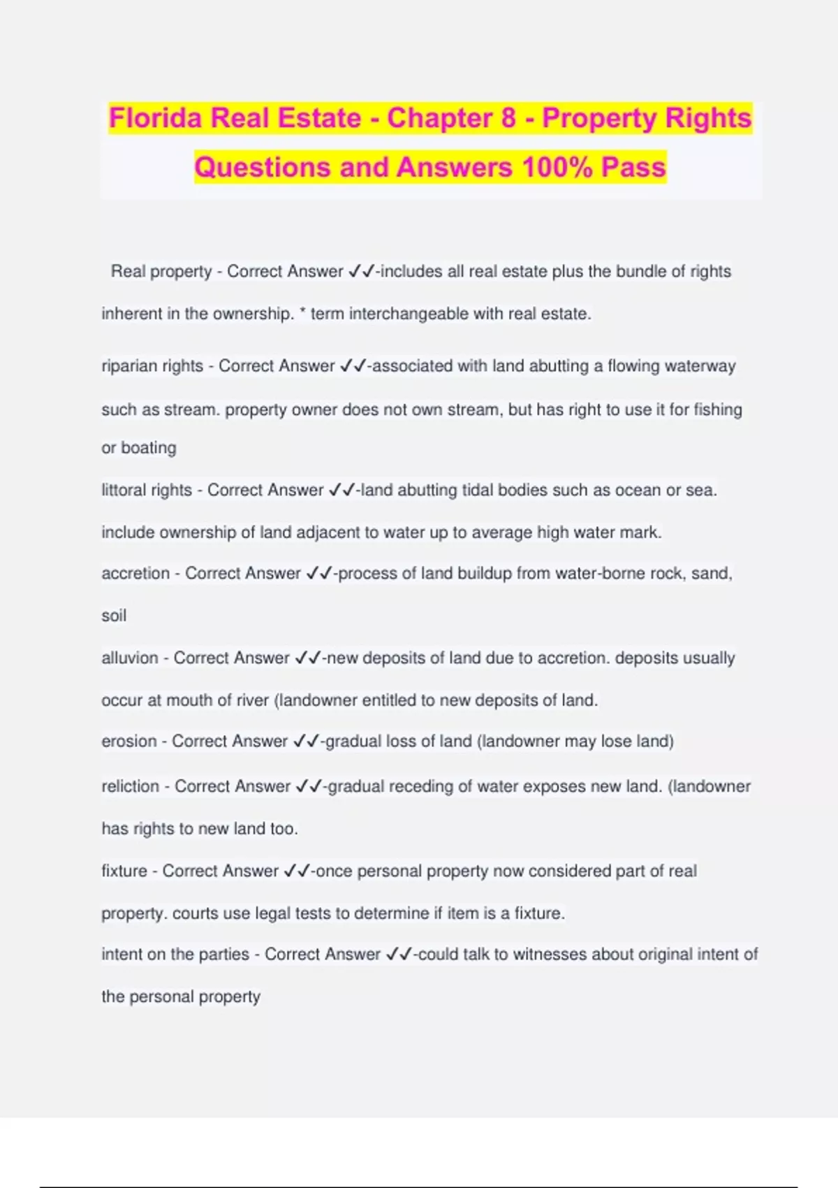 Florida Real Estate - Chapter 8 - Property Rights Questions and Answers 100% Pass Real property - Correct Answer ️️ -includes all real estate plus the bundle of rights inherent in the ownership. * term interchangeable with real estate. riparian rights - Correct Answer ️️ -associated with land abutting a flowing waterway such as stream. property owner does not own stream, but has right to use it for fishing or boating littoral rights - Correct Answer ️️ -land abutting tidal bodies such as ocean or sea. include ownership of land adjacent to water up to average high water mark. accretion - Correct Answer ️️ -process of land buildup from water-borne rock, sand, soil alluvion - Correct Answer ️️ -new deposits of land due to accretion. deposits usually occur at mouth of river (landowner entitled to new deposits of land. erosion - Correct Answer ️️ -gradual loss of land (landowner may lose land) reliction - Correct Answer ️️ -gradual receding of water exposes new land. (landowner has rights to new land too. fixture - Correct Answer ️️ -once personal property now considered part of real property. courts use legal tests to determine if item is a fixture. intent on the parties - Correct Answer ️️ -could talk to witnesses about original intent of the personal property relationship or agreement of parties` - Correct Answer ️️ -court seeks to determine exact nature of relationship of parties, buyer and seller or landlord and tenant. building leased as a retail store could have trade fixtures inside that can be removed. method of detachment - Correct Answer ️️ -manner in which object is attached determines if its a fixture. such as built in storage cabinets or recessed lights. adaptation of the item - Correct Answer ️️ -generally if item is custom built for property, it is a fixture. example: hurricane shutters. basic property rights - Correct Answer ️️ -bundle of legal rights -disposition -enjoyment -exclusion -possession -control estates and tenancies - Correct Answer ️️ -freehold est