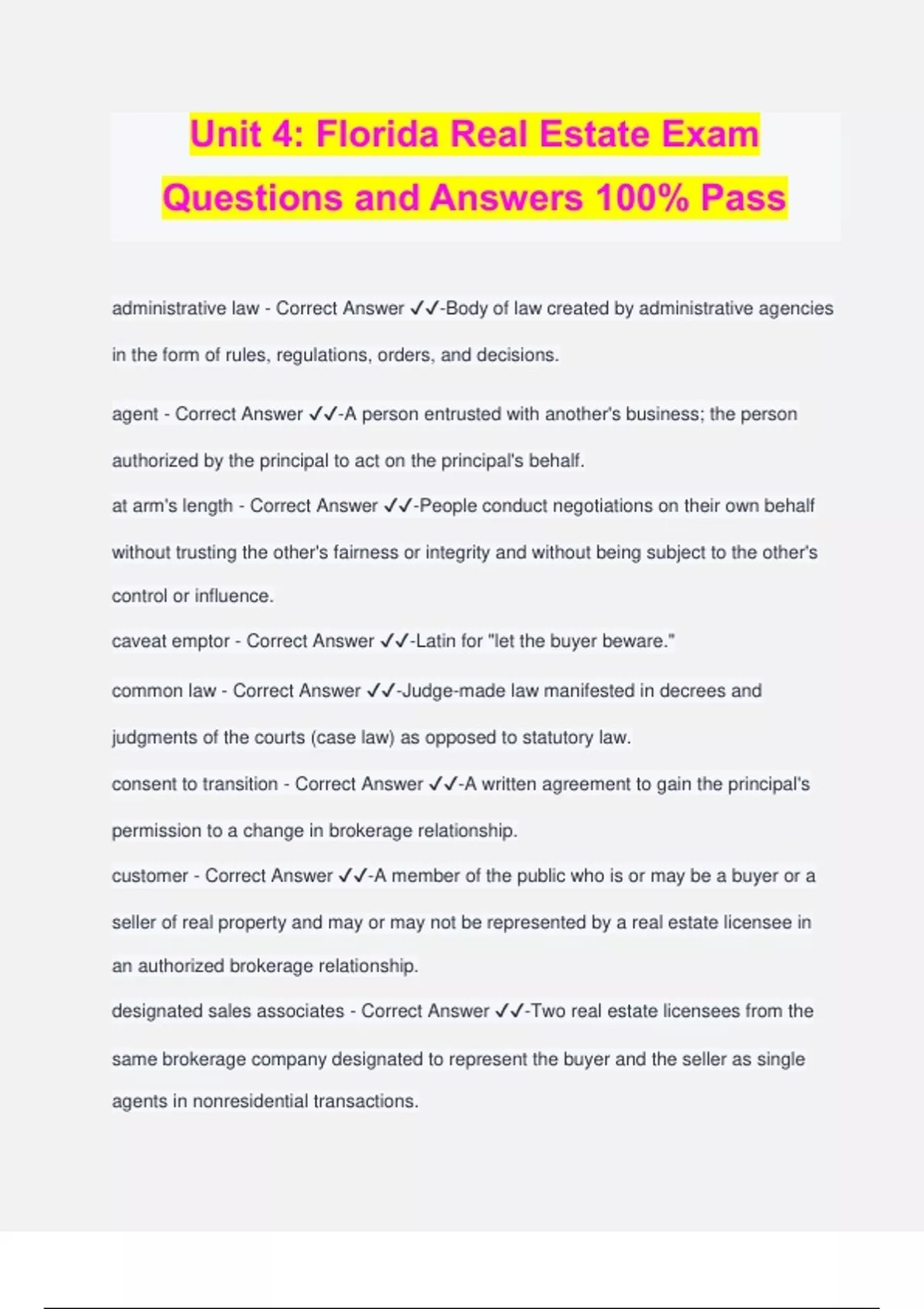 Unit 4: Florida Real Estate Exam Questions and Answers 100% Pass administrative law - Correct Answer ️️ -Body of law created by administrative agencies in the form of rules, regulations, orders, and decisions. agent - Correct Answer ️️ -A person entrusted with another's business; the person authorized by the principal to act on the principal's behalf. at arm's length - Correct Answer ️️ -People conduct negotiations on their own behalf without trusting the other's fairness or integrity and without being subject to the other's control or influence. caveat emptor - Correct Answer ️️ -Latin for "let the buyer beware." common law - Correct Answer ️️ -Judge-made law manifested in decrees and judgments of the courts (case law) as opposed to statutory law. consent to transition - Correct Answer ️️ -A written agreement to gain the principal's permission to a change in brokerage relationship. customer - Correct Answer ️️ -A member of the public who is or may be a buyer or a seller of real property and may or may not be represented by a real estate licensee in an authorized brokerage relationship. designated sales associates - Correct Answer ️️ -Two real estate licensees from the same brokerage company designated to represent the buyer and the seller as single agents in nonresidential transactions. dual agency - Correct Answer ️️ -Representing both principals in a transaction (not a legal agency relationship in Florida). dual agent - Correct Answer ️️ -A broker who represents as a fiduciary both the buyer and the seller in a residential real estate transaction; dual agency is illegal in Florida. fiduciary - Correct Answer ️️ -Occurs when a broker is in a relationship of trust and confidence with the broker as agent and the seller or the buyer as principal. fraud - Correct Answer ️️ -The intent to misrepresent a material fact or to deceive to gain an unfair advantage or to harm another person. general agent - Correct Answer ️️ -An agent authorized by the principal to handle the affairs related to a business or trade, or to handle all the business at a certain location; for example, a property manager. Limited Representation - Correct Answer ️️ -Transaction brokers provide a limited form of nonfiduciary representation to a buyer, a seller, or both in a real estate transaction. misrepresentation - Correct Answer ️️ -The misstatement of fact or the omission or concealment of a factual matter no brokerage relationship - Correct Answer ️️ -The parties may agree that the brokerage firm will not represent the buyer or the seller at all. The brokerage firm simply facilitates the transaction. principal - Correct Answer ️️ -The party employing the services of a real estate broker; amount of money borrowed in a mortgage loan, excluding interest and other charges. puffing - Correct Answer ️️ -The term used to describe a licensee's boastin