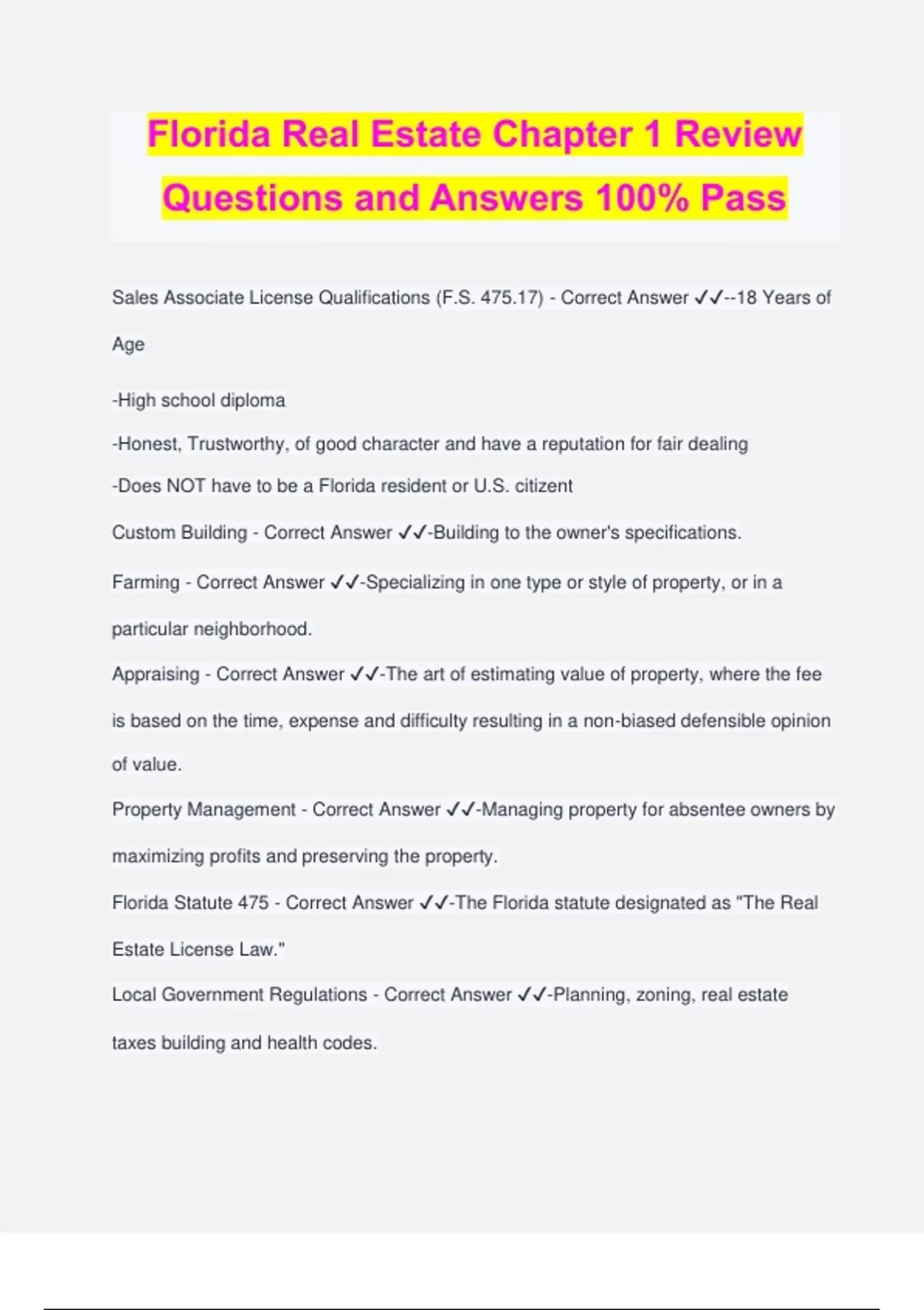 Florida Real Estate Chapter 1 Review Questions and Answers 100% Pass Sales Associate License Qualifications (F.S. 475.17) - Correct Answer ️️ --18 Years of Age -High school diploma -Honest, Trustworthy, of good character and have a reputation for fair dealing -Does NOT have to be a Florida resident or U.S. citizent Custom Building - Correct Answer ️️ -Building to the owner's specifications. Farming - Correct Answer ️️ -Specializing in one type or style of property, or in a particular neighborhood. Appraising - Correct Answer ️️ -The art of estimating value of property, where the fee is based on the time, expense and difficulty resulting in a non-biased defensible opinion of value. Property Management - Correct Answer ️️ -Managing property for absentee owners by maximizing profits and preserving the property. Florida Statute 475 - Correct Answer ️️ -The Florida statute designated as "The Real Estate License Law." Local Government Regulations - Correct Answer ️️ -Planning, zoning, real estate taxes building and health codes. State Government Regulations - Correct Answer ️️ -Roads, waterways, state documentary taxes on all property transfers. Federal Government Regulations - Correct Answer ️️ -National monetary supply, legislation affecting lending institutions. Dedication - Correct Answer ️️ -When a developer conveys the streets and sidewalks in a subdivision to the city. Tract Building - Correct Answer ️️ -Developers utilizing model homes to make sales from. Speculative Building - Correct Answer ️️ -A contractor builds on his