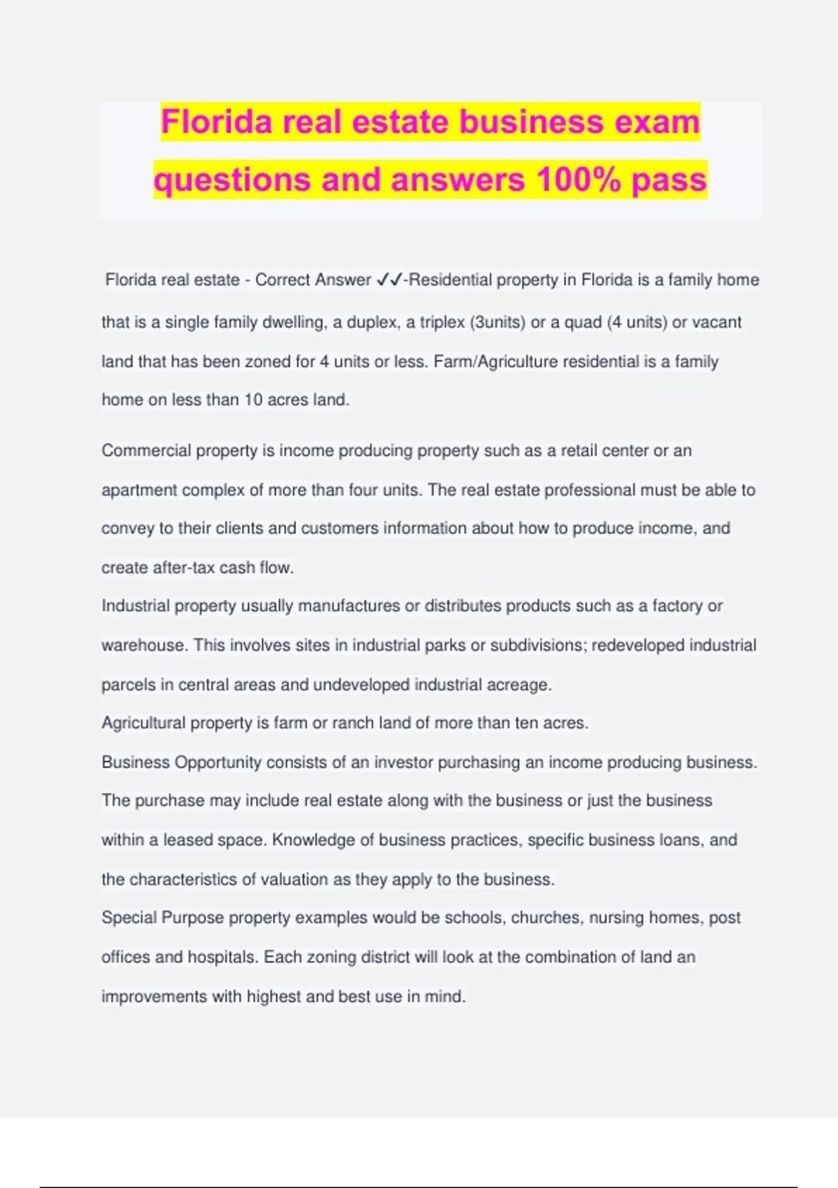 Florida real estate business exam questions and answers 100% pass Florida real estate - Correct Answer ️️ -Residential property in Florida is a family home that is a single family dwelling, a duplex, a triplex (3units) or a quad (4 units) or vacant land that has been zoned for 4 units or less. Farm/Agriculture residential is a family home on less than 10 acres land. Commercial property is income producing property such as a retail center or an apartment complex of more than four units. The real estate professional must be able to convey to their clients and customers information about how to produce income, and create after-tax cash flow. Industrial property usually manufactures or distributes products such as a factory or warehouse. This involves sites in industrial parks or subdivisions; redeveloped industrial parcels in central areas and undeveloped industrial acreage. Agricultural property is farm or ranch land of more than ten acres. Business Opportunity consists of an investor purchasing an income producing business. The purchase may include real estate along with the business or just the business within a leased space. Knowledge of business practices, specific business loans, and the characteristics of valuation as they apply to the business. Special Purpose property examples would be schools, churches, nursing homes, post offices and hospitals. Each zoning district will look at the combination of land an improvements with highest and best use in mind. Residential property - Correct Answer ️️ -in Florida is a family home that is a single family dwelling, a duplex, a triplex (3units) or a quad (4 units) or vacant land that has been zoned for 4 units or less. Farm/Agriculture residential is a family home on less than 10 acres land. Commercial property - Correct Answer ️️ -is income producing property such as a retail center or an apartment complex of more than four units. The real estate professional must be able to convey to their clients and customers information about how to produce income, and create after-tax cash flow. Industrial property - Correct Answer ️️ -usually manufactures or distributes products such as a factory or warehouse. This involves sites in industrial parks or subdivisions; redeveloped industrial parcels in central areas and undeveloped industrial acreage. Agricultural property - Correct Answer ️️ -is farm or ranch land of more than ten acres. Business Opportunity - Correct Answer ️️ -consists of an investor purchasing an income producing business. The purchase may include real estate along with the business or just the business within a leased space. Knowledge of business practices, specific business loans, and the characteristics of valuation as they apply to the business. Special Purpose property - Correct Answer ️️ -examples would be schools, churches, nursing homes, post offices and hospitals. Each zoning district will look