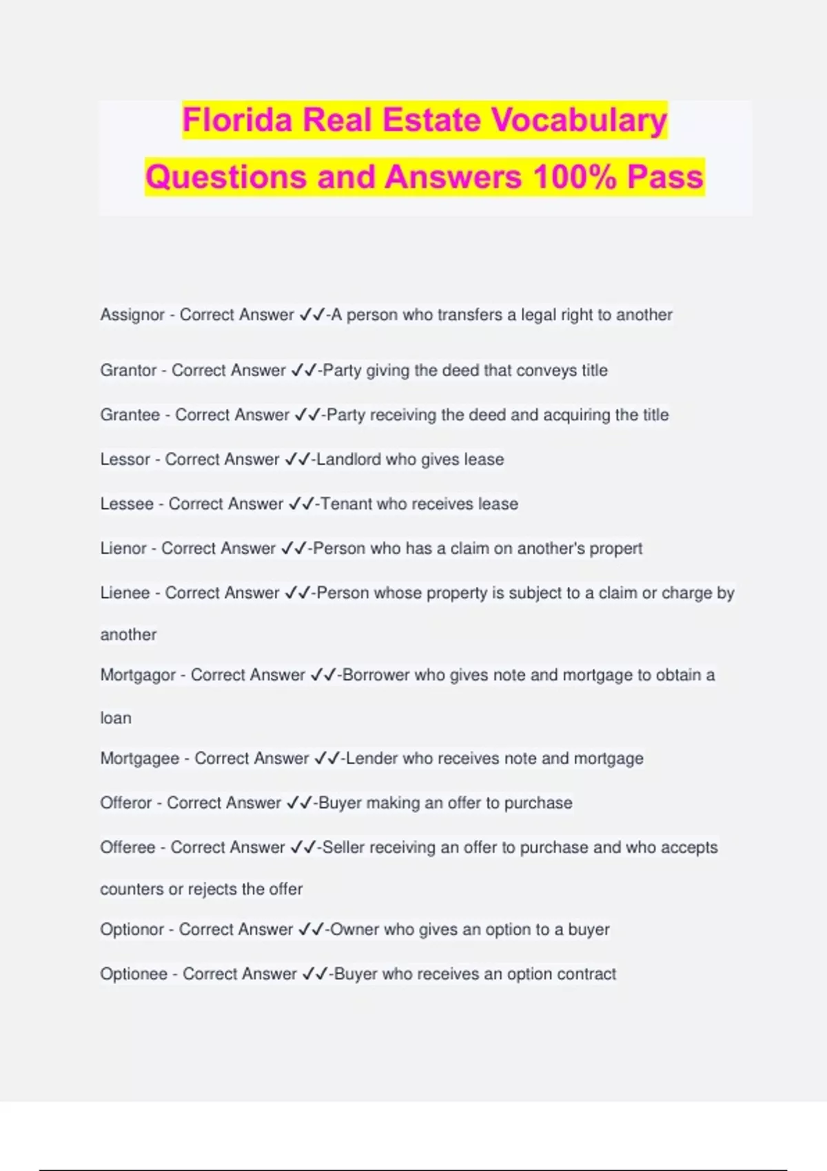 Florida Real Estate Vocabulary Questions and Answers 100% Pass