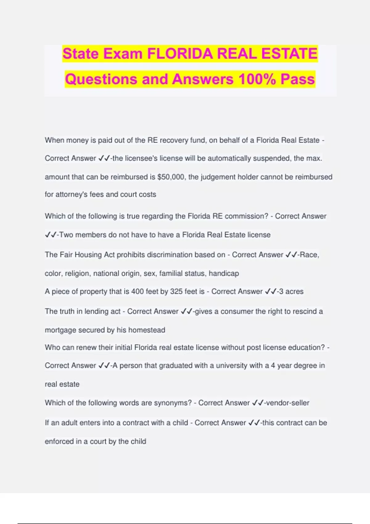 State Exam FLORIDA REAL ESTATE Questions and Answers 100% Pass When money is paid out of the RE recovery fund, on behalf of a Florida Real Estate - Correct Answer ️️ -the licensee's license will be automatically suspended, the max. amount that can be reimbursed is $50,000, the judgement holder cannot be reimbursed for attorney's fees and court costs Which of the following is true regarding the Florida RE commission? - Correct Answer ️️ -Two members do not have to have a Florida Real Estate license The Fair Housing Act prohibits discrimination based on - Correct Answer ️️ -Race, color, religion, national origin, sex, familial status, handicap A piece of property that is 400 feet by 325 feet is - Correct Answer ️️ -3 acres The truth in lending act - Correct Answer ️️ -gives a consumer the right to rescind a mortgage secured by his homestead Who can renew their initial Florida real estate license without post license education? - Correct Answer ️️ -A person that graduated with a university with a 4 year degree in real estate Which of the following words are synonyms? - Correct Answer ️️ -vendor-seller If an adult enters into a contract with a child - Correct Answer ️️ -this contract can be enforced in a court by the child Price Fixing is - Correct Answer ️️ -a violation of Sherman-clayton antitrust law In a joint tenancy - Correct Answer ️️ -has the right of survivorship and owners acquire interest at the same time An expressed contract - Correct Answer ️️ -is unambiguous To become the chairman of the Florida Real Estate Commission - Correct Answer ️️ -a member is elected by his or her peers A florida Real Estate license - Correct Answer ️️ -has an expiration date on it, expires biennially, serves as prima facie evidence that the holder is properly licensed Florida Real estate licensee cannot promise to re-purchase property back in the future unless - Correct Answer ️️ -a guaranteed re-purchae agreement has been approved by the state of florida A florida real estate salesman must turn escrow money over to his broker - Correct Answer ️️ -before the end of the business day following the day he received the money A florida real estate broker can have - Correct Answer ️️ -an interest bearing escrow account Which of the following would a buyer certainly not get at closing - Correct Answer ️️ - certificate of title When the gov. exercises the power of eminent domain, which of the following statements is NOT true - Correct Answer ️️ -Homestead will protect a widow from eminent domain When a person dies intestate with no heirs - Correct Answer ️️ -Their Real Estate passes to the Florida gov. through a process called escheat Actual notice is - Correct Answer ️️ -something you have learned by reading, seeing, or hearing Minnie Me mortgage back securities - Correct Answer ️️ -carry the full
