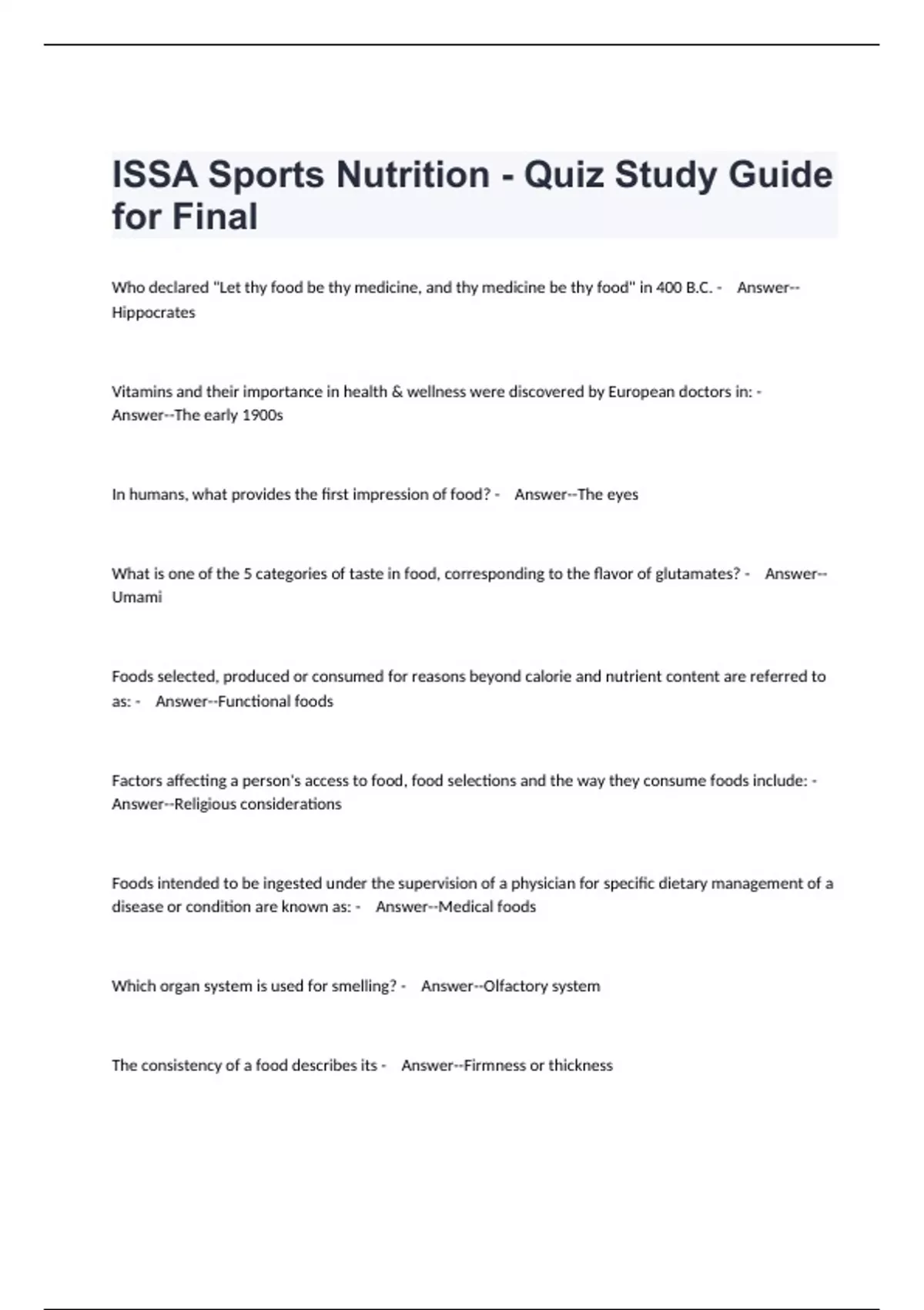 Who declared "Let thy food be thy medicine, and thy medicine be thy food" in 400 B.C. - Answer--Hippocrates Vitamins and their importance in health & wellness were discovered by European doctors in: - Answer--The early 1900s In humans, what provides the first impression of food? - Answer--The eyes What is one of the 5 categories of taste in food, corresponding to the flavor of glutamates? - Answer--Umami Foods selected, produced or consumed for reasons beyond calorie and nutrient content are referred to as: - Answer--Functional foods Factors affecting a person's access to food, food selections and the way they consume foods include: - Answer--Religious considerations Foods intended to be ingested under the supervision of a physician for specific dietary management of a disease or condition are known as: - Answer--Medical foods Which organ system is used for smelling? - Answer--Olfactory system The consistency of a food describes its - Answer--Firmness or thickness