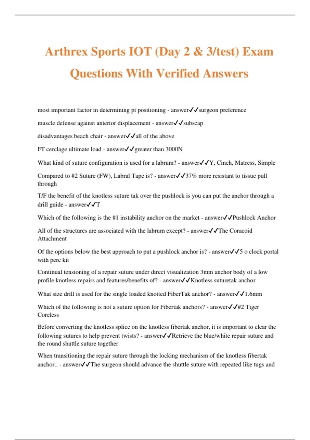 Arthrex Sports IOT (Day 2 & 3/test) Exam Questions With Verified Answers