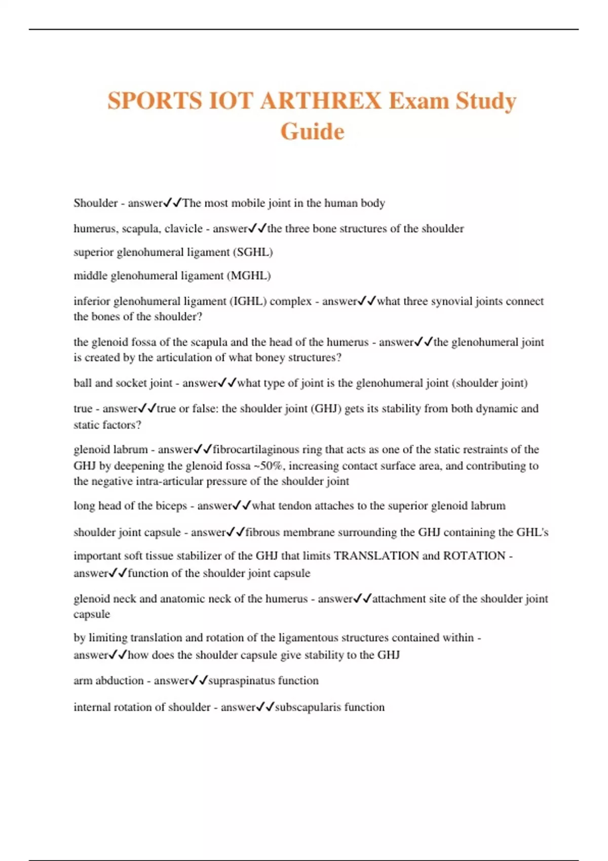 SPORTS IOT ARTHREX Exam Study Guide Shoulder - answerThe most mobile joint in the human body humerus, scapula, clavicle - answerthe three bone structures of the shoulder superior glenohumeral ligament (SGHL) middle glenohumeral ligament (MGHL) inferior glenohumeral ligament (IGHL) complex - answerwhat three synovial joints connect the bones of the shoulder? the glenoid fossa of the scapula and the head of the humerus - answerthe glenohumeral joint is created by the articulation of what boney structures? ball and socket joint - answerwhat type of joint is the glenohumeral joint (shoulder joint) true - answertrue or false: the shoulder joint (GHJ) gets its stability from both dynamic and static factors? glenoid labrum - answerfibrocartilaginous ring that acts as one of the static restraints of the GHJ by deepening the glenoid fossa ~50%, increasing contact surface area, and contributing to the negative intra-articular pressure of the shou