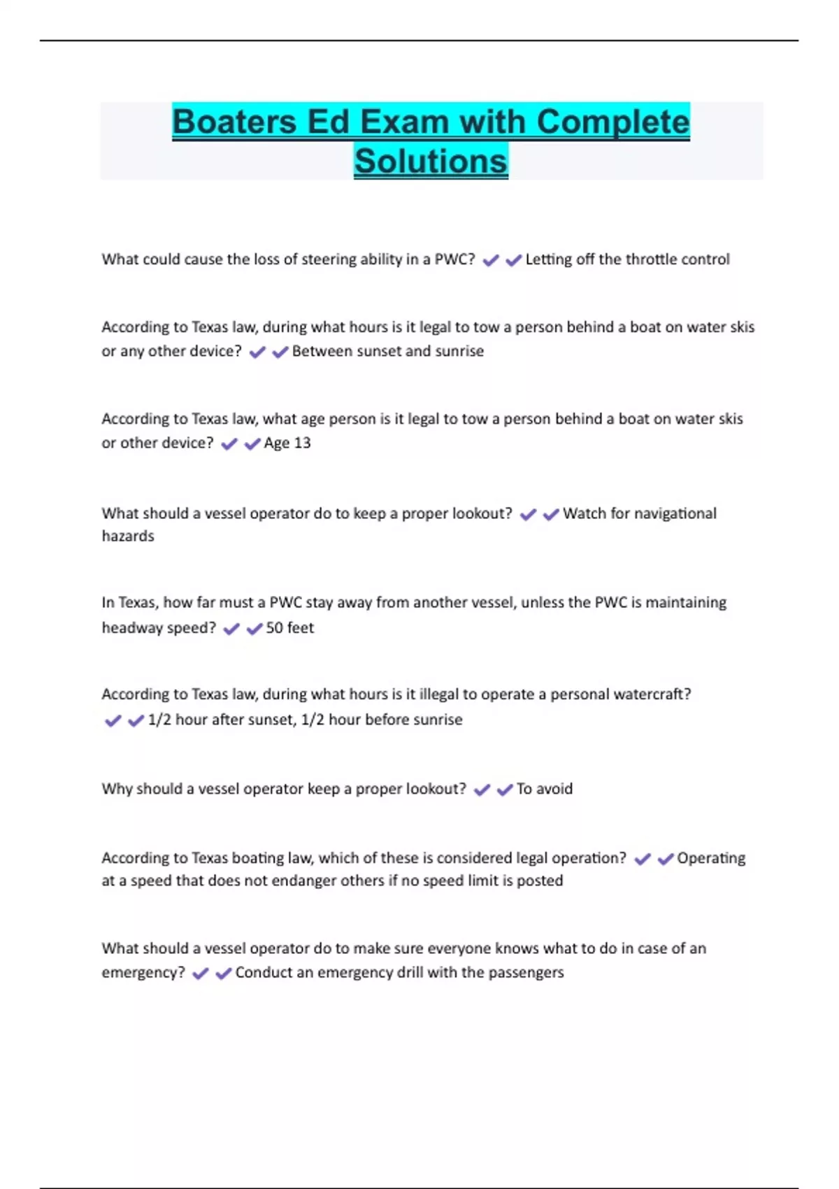 Boaters Ed Exam with Complete Solutions What could cause the loss of steering ability in a PWC? Letting off the throttle control According to Texas law, during what hours is it legal to tow a person behind a boat on water skis or any other device? Between sunset and sunrise According to Texas law, what age person is it legal to tow a person behind a boat on water skis or other device? Age 13 What should a vessel operator do to keep a proper lookout? Watch for navigational hazards In Texas, how far must a PWC stay away from another vessel, unless the PWC is maintaining headway speed? 50 feet