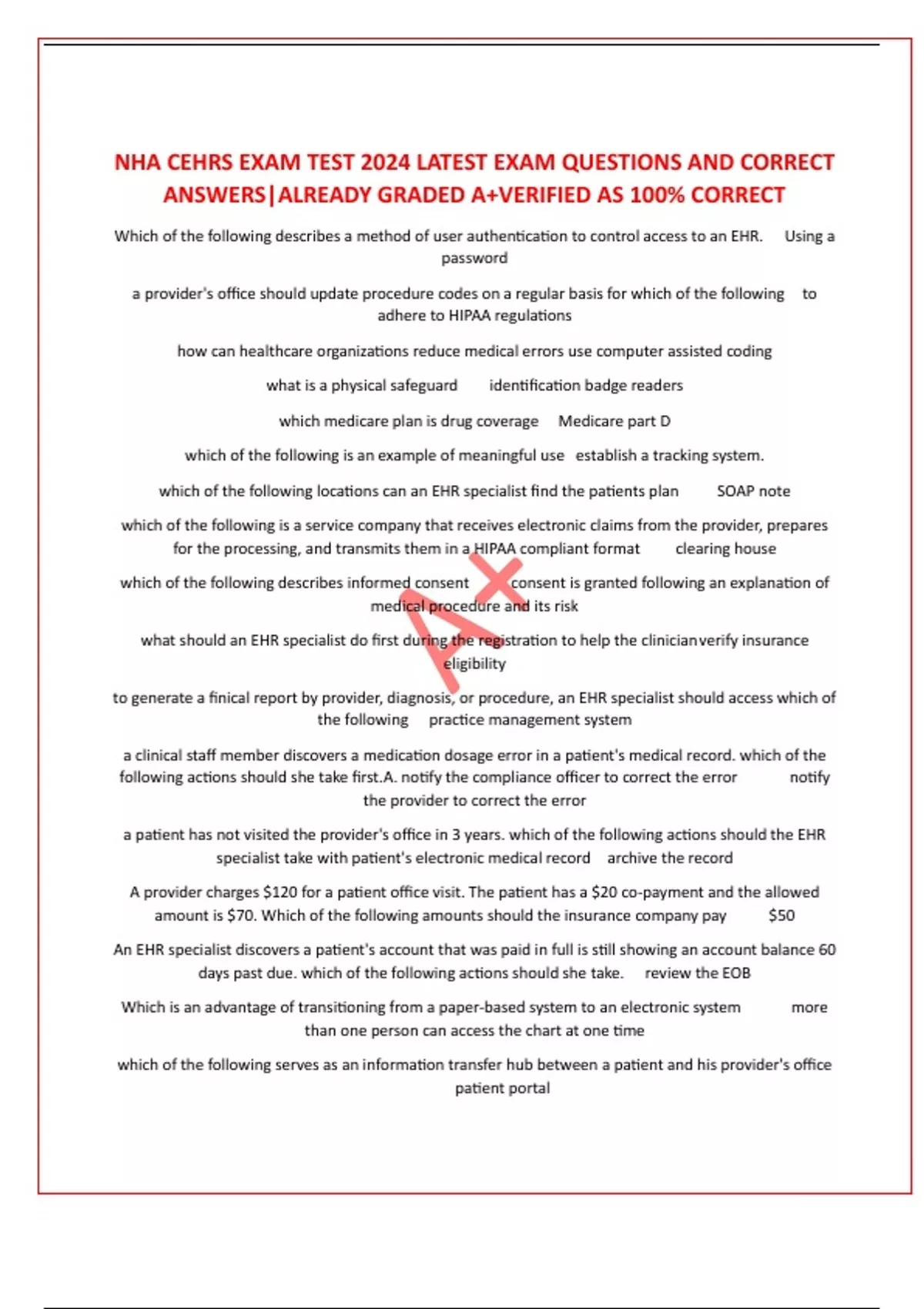 NHA CEHRS EXAM TEST 2024 LATEST EXAM QUESTIONS AND CORRECT ANSWERS|ALREADY GRADED A+VERIFIED AS 100% CORRECT Which of the following describes a method of user authentication to control access to an EHR. Using a password a provider's office should update procedure codes on a regular basis for which of the following to adhere to HIPAA regulations how can healthcare organizations reduce medical errors use computer assisted coding what is a physical safeguard identification badge readers which medicare plan is drug coverage Medicare part D which of the following is an example of meaningful use establish a tracking system. which of the following locations can an EHR specialist find the patients plan SOAP note which of the following is a service company that receives electronic claims from the provider, prepares for the processing, and transmits them in a HIPAA compliant format clearing house which of the following describes informed consent consent is granted following an explanation of medical procedure and its risk what should an EHR specialist do first during the registration to help the clinician verify insurance eligibility to generate a finical report by provider, diagnosis, or procedure, an EHR specialist should access which of the following practice management system a clinical staff member discovers a medication dosage error in a patient's medical record. which of the following actions should she take first.A. notify the compliance officer to correct the error notify the provider to correct the error a patient has not visited the provider's office in 3 years. which of the following actions should the EHR specialist take with patient's electronic medical record archive the record A provider charges $120 for a patient office visit. The patient has a $20 co-payment and the allowed amount is $70. Which of the following amounts should the insurance company pay $50 An EHR specialist discovers a patient's account that was paid in full is still showing an account balance 60 days past due. which of the following actions should she take. review the EOB Which is an advantage of transitioning from a paper-based system to an electronic system more than one perso