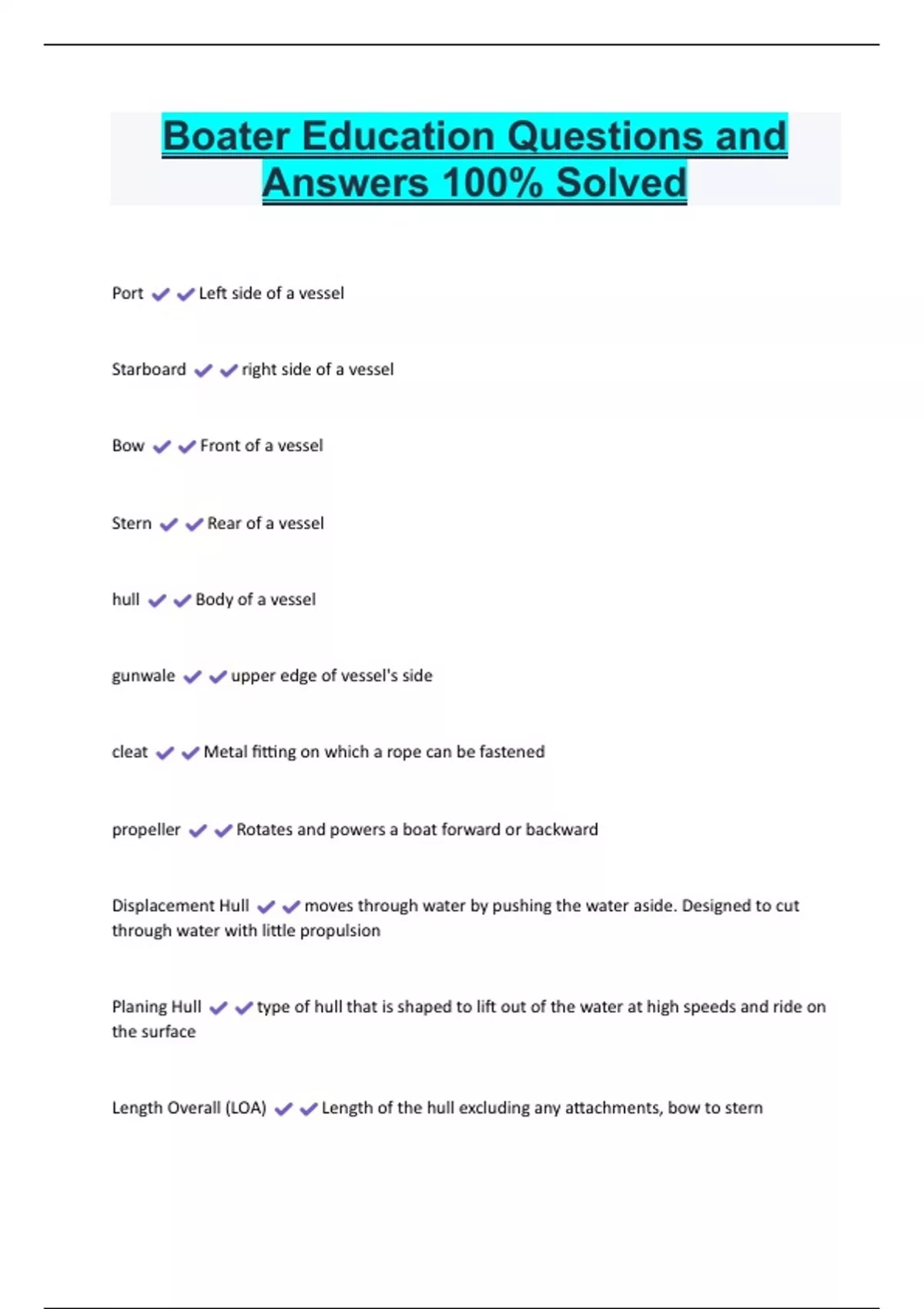 Boater Education Questions and Answers 100% Solved Port Left side of a vessel Starboard right side of a vessel Bow Front of a vessel Stern Rear of a vessel hull Body of a vessel gunwale upper edge of vessel's side cleat Metal fitting on which a rope can be fastened propeller Rotates and powers a boat forward or backward Displacement Hull moves through water by pushing the water aside. Designed to cut through water with little propulsion
