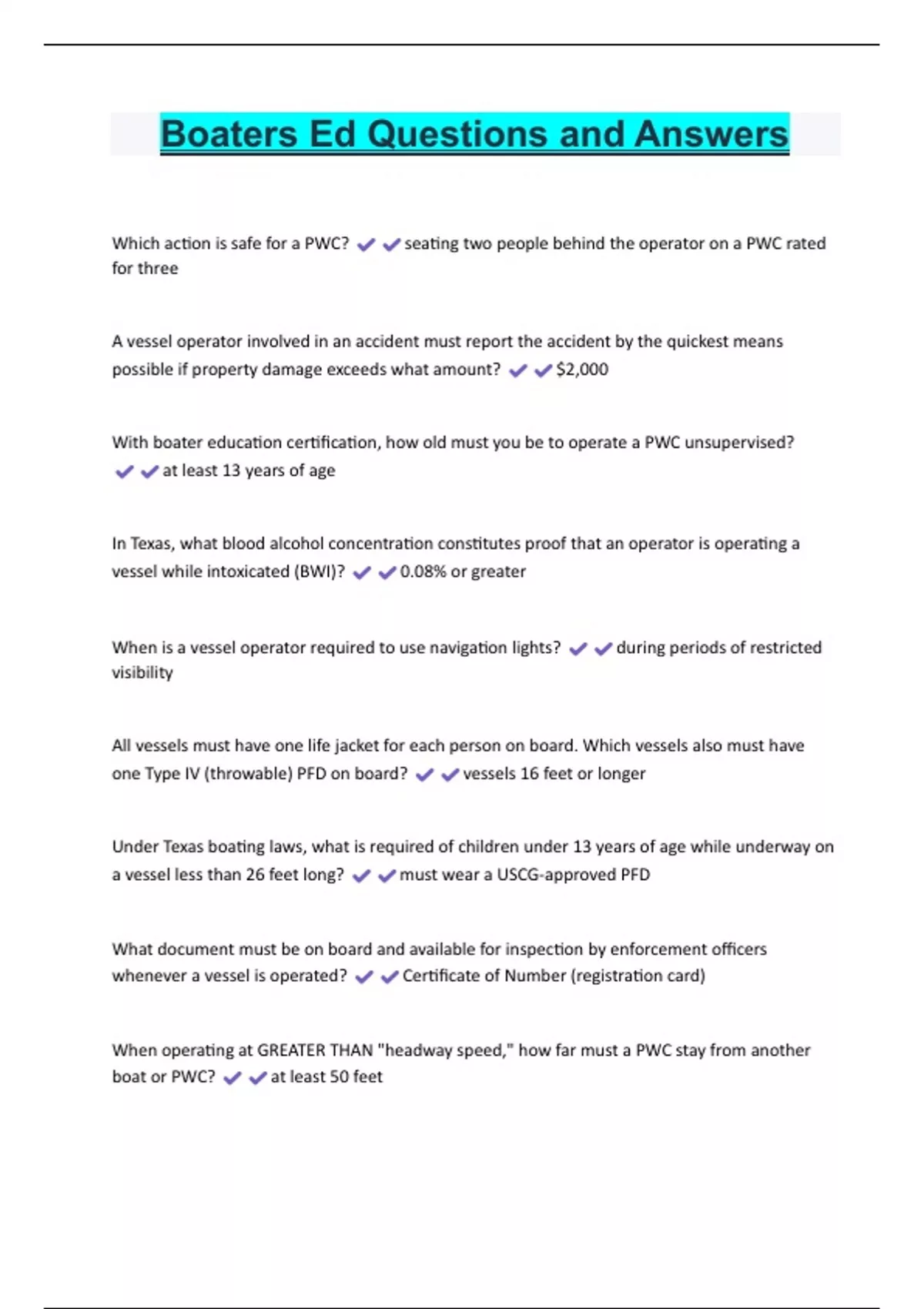 Boaters Ed Questions and Answers Which action is safe for a PWC? seating two people behind the operator on a PWC rated for three A vessel operator involved in an accident must report the accident by the quickest means possible if property damage exceeds what amount? $2,000 With boater education certification, how old must you be to operate a PWC unsupervised? at least 13 years of age In Texas, what blood alcohol concentration constitutes proof that an operator is operating a vessel while intoxicated (BWI)? 0.08% or greater When is a vessel operator required to use navigation lights? during periods of restricted visibility All vessels must have one life jacket for each person on board. Which vessels also must have one Type IV (throwable) PFD on board? vessels 16 feet or longer Under Texas boating laws, what is required of children under 13 years o