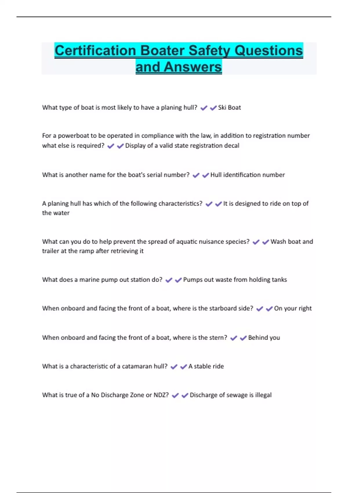 Certification Boater Safety Questions and Answers What type of boat is most likely to have a planing hull? Ski Boat For a powerboat to be operated in compliance with the law, in addition to registration number what else is required? Display of a valid state registration decal What is another name for the boat's serial number? Hull identification number A planing hull has which of the following characteristics? It is designed to ride on top of the water What can you do to help prevent the spread of aquatic nuisance species? Wash boat and
