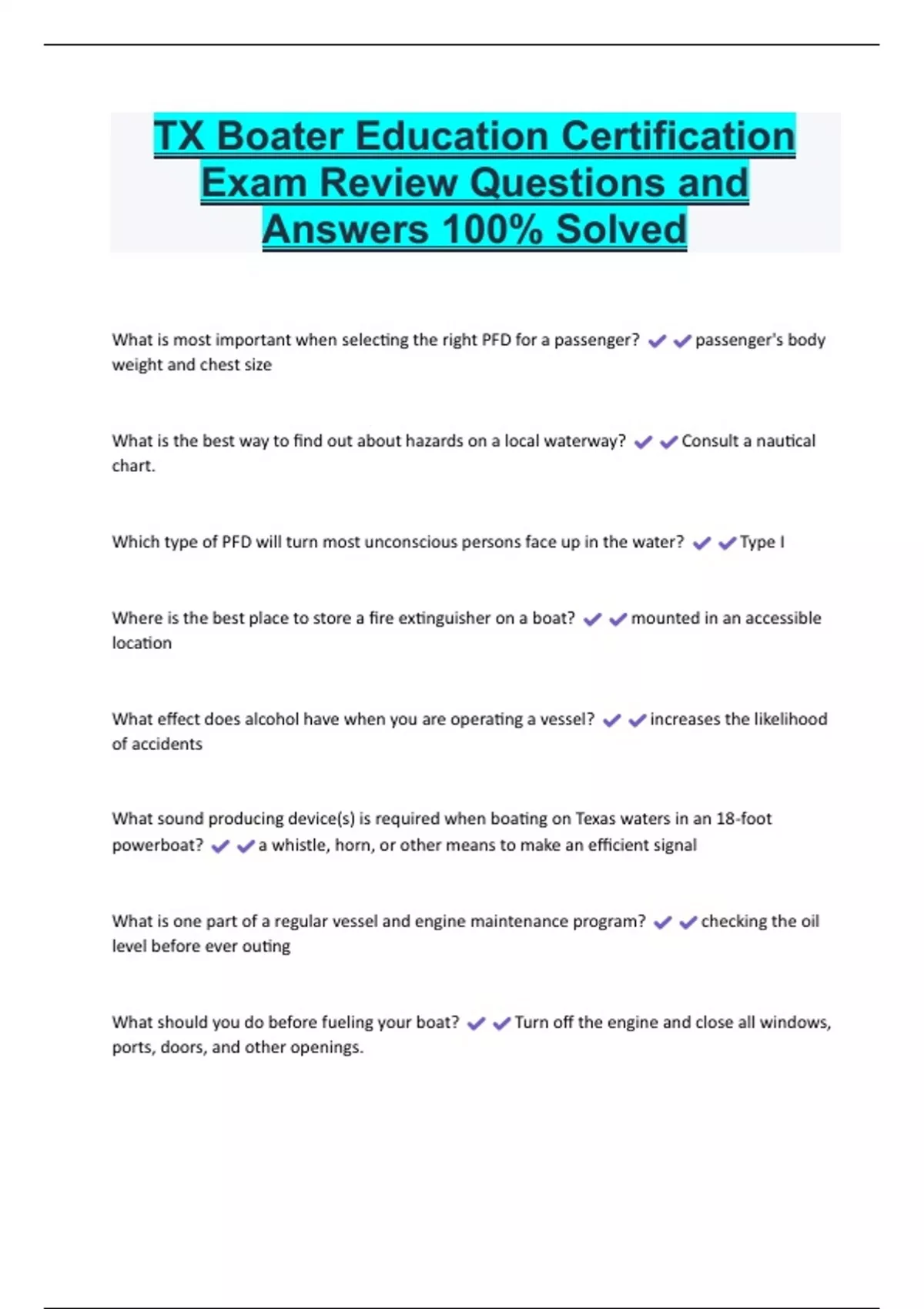 TX Boater Education Certification Exam Review Questions and Answers 100% Solved What is most important when selecting the right PFD for a passenger? passenger's body weight and chest size What is the best way to find out about hazards on a local waterway? Consult a nautical chart. Which type of PFD will turn most unconscious persons face up in the water? Type I Where is the best place to store a fire extinguisher on a boat? mounted in an accessible location What effect does alcohol have when you are operating a vessel? increases the likelihood of accidents What sound producing device(s) is required when boating on Texas waters in an 18-foot powerboat? a whistle, horn, or other means to make an efficient signal