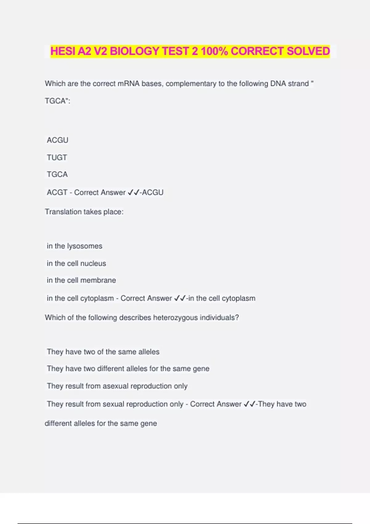 HESI A2 V2 BIOLOGY TEST 2 100% CORRECT SOLVED Which are the correct mRNA bases, complementary to the following DNA strand " TGCA": ACGU TUGT TGCA ACGT - Correct Answer ️️ -ACGU Translation takes place: in the lysosomes in the cell nucleus in the cell membrane in the cell cytoplasm - Correct Answer ️️ -in the cell cytoplasm Which of the following describes heterozygous individuals? They have two of the same alleles They have two different alleles for the same gene They result from asexual reproduction only They result from sexual reproduction only - Correct Answer ️️ -They have two different alleles for the same gene Which of the following correctly lists the hierarchic system of classification from most inclusive to least inclusive? Kingdom, Phylum, Order, Class, Family, Genus, Species Kingdom, Phylum, Class, Family, Order, Genus, Species Kingdom, Phylum, Class, Order, Family, Genus, Species Kingdom, Phylum, Order, Family, Class, Genus, Species - Correct Answer ️️ - Kingdom, Phylum, Class, Order, Family, Genus, Species A repeatable procedure of gathering data to support or refute a hypothesis is known as conducting an experiment the scientific method drawing a conclusion developing a theory - Correct Answer ️️ -conducting an experiment Which of the following is not true about water? When water freezes, it forms a lattice crystal, causing ice to float. Large bodies of water stabilize climates due to water's high specific heat. The polarity of water's bonds allows for covalent bonding between molecules. Hydrogen bonding results in water having strong cohesive and adhesive properties. - Correct Answer ️️ -The polarity of water's bonds allows for covalent bonding between molecules. Which biologic molecule would you recommend a patient limit if they want to avoid having cardiovascular problems? Unsaturated fats Carbohydrates Phospholipids Saturated fats - Correct Answer ️️ -Saturated fats DNA and RNA are subunits of which type of biologic molecule? Proteins Lipids Nucleic acids Carbohydrates - Correct Answer ️️ -Nucleic acids Which type of protein acts to catalyze different reactions or processes?