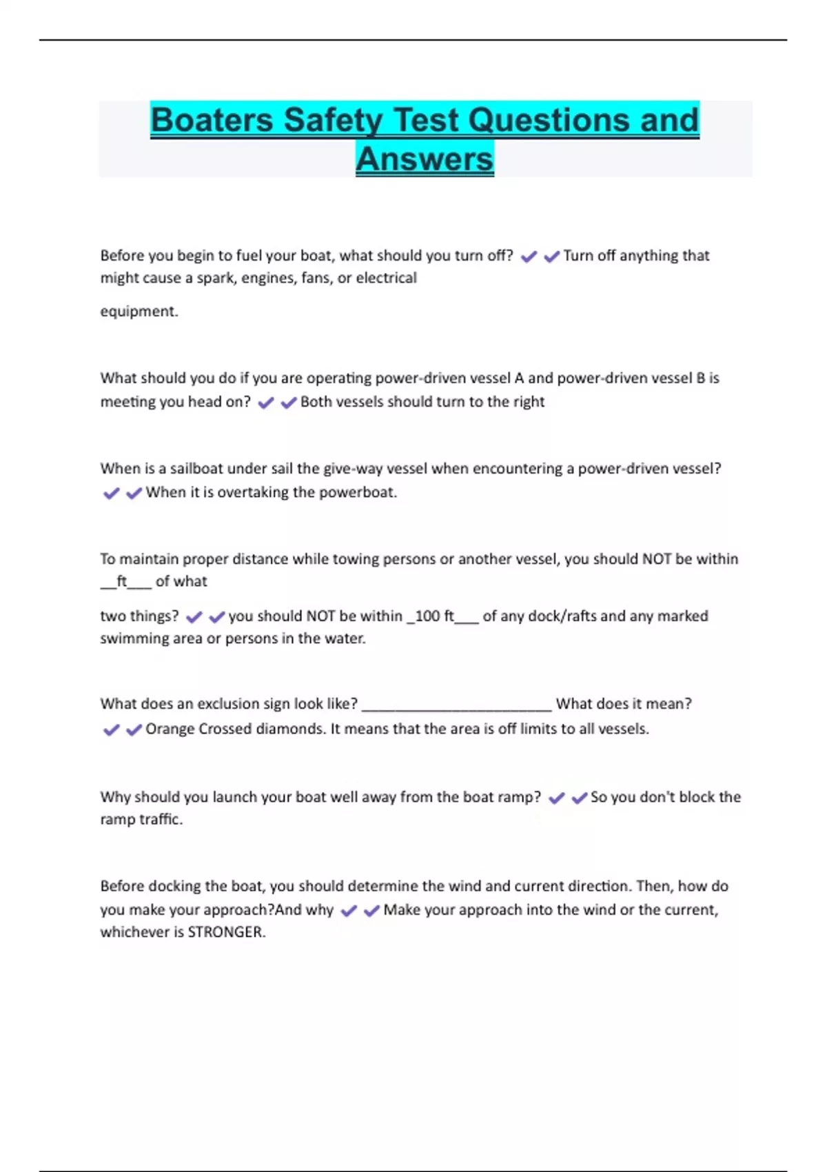 Boaters Safety Test Questions and Answers Before you begin to fuel your boat, what should you turn off? Turn off anything that might cause a spark, engines, fans, or electrical equipment. What should you do if you are operating power-driven vessel A and power-driven vessel B is meeting you head on? Both vessels should turn to the right When is a sailboat under sail the give-way vessel when encountering a power-driven vessel? When it is overtaking the powerboat. To maintain proper distance while towing persons or another vessel, you should NOT be within __ft___ of what two things? you should NOT be within _100 ft___ of any dock/rafts and any marked swimming area or persons in the water. What does an exclusion sign look like? _______________________ What does it mean? Orange Crossed diamonds. It means that the area is off limits to all vessels.