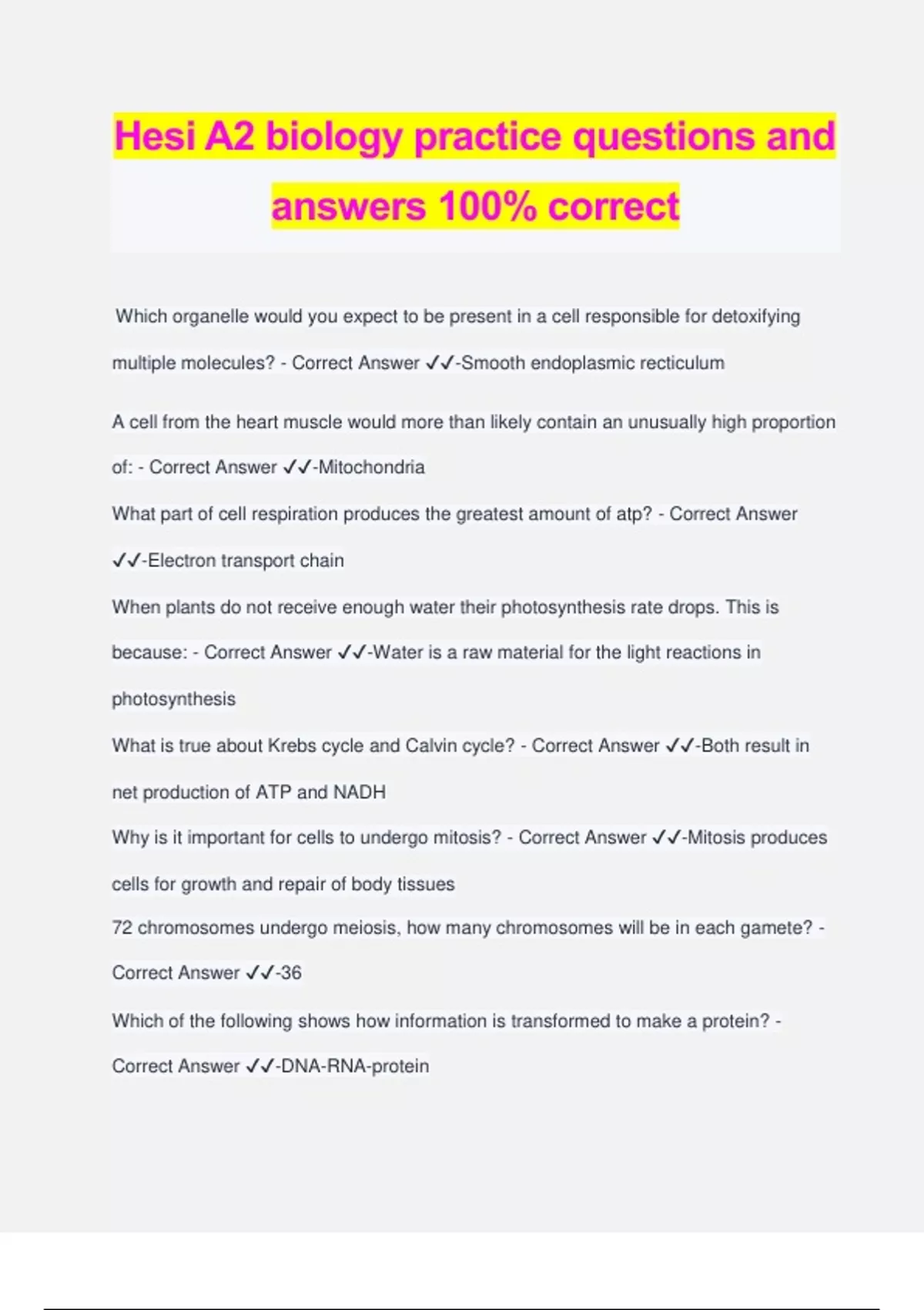 Hesi A2 biology practice questions and answers 100% correct Which organelle would you expect to be present in a cell responsible for detoxifying multiple molecules? - Correct Answer ️️ -Smooth endoplasmic recticulum A cell from the heart muscle would more than likely contain an unusually high proportion of: - Correct Answer ️️ -Mitochondria What part of cell respiration produces the greatest amount of atp? - Correct Answer ️️ -Electron transport chain When plants do not receive enough water their photosynthesis rate drops. This is because: - Correct Answer ️️ -Water is a raw material for the light reactions in photosynthesis What is true about Krebs cycle and Calvin cycle? - Correct Answer ️️ -Both result in net production of ATP and NADH Why is it important for cells to undergo mitosis? - Correct Answer ️️ -Mitosis produces cells for growth and repair of body tissues 72 chromosomes undergo meiosis, how many chromosomes will be in each gamete? - Correct Answer ️️ -36 Which of the following shows how information is transformed to make a protein? - Correct Answer ️️ -DNA-RNA-protein What is the purpose of Pholem tissue in plant stems? - Correct Answer ️️ -It conducts energy of light to leaves Physical factors such as temperature and physiology can alter enzyme activity because they have an effect on the enzymes.. - Correct Answer ️️ -Shape What part of a plants reproductive system is a different "gender" than all of the others? - Correct Answer ️️ -Stamen Beeswax is an example of what kind of molecule? - Correct Answer ️️ -Lipid What takes place in a lysosomes? - Correct Answer ️️ -Food is digested Which organism reproduces via binary fission? - Correct Answer ️️ -Salmonella In which phase of cell division do chromosomes replicate? - Correct Answer ️️ - Interphase What is this formula? 6CO2 + 6H20 --> C6H12O6 + 6O2 - Correct Answer ️️ -Photosynthesis Which statement regarding energy content is true? - Correct Answer ️️ -Producers > secondary consumers Why do we perceive chlorophyll as green? - Correct Answer ️️ -It fails to absorb green light Why are bacteria and blue-green algae often classified together? - Correct Answer ️️ - Both are prokaryotes Which of these molecules contains glucose? - Correct Answer ️️ -Carbohydrates What happens to glucose during glycolysis - Correct Answer ️️ -It splits into molecules of pyruvic acid What process do cells in the tip of a plants root undergo to increase in number? - Correct Answer ️️ -Mitosis How do rna and DNA derive their names? - Correct Answer ️️ -From the sugar each contains If bacteria are placed in a strong solution of salt water they will shrink as water moves out of the bacteria. What is this process called? - Correct Answer ️️ -Osmosis Which animal has an open transport system? - Correct Answer ️️ -Grasshopper How does an enzyme work on a chemical reaction that occu