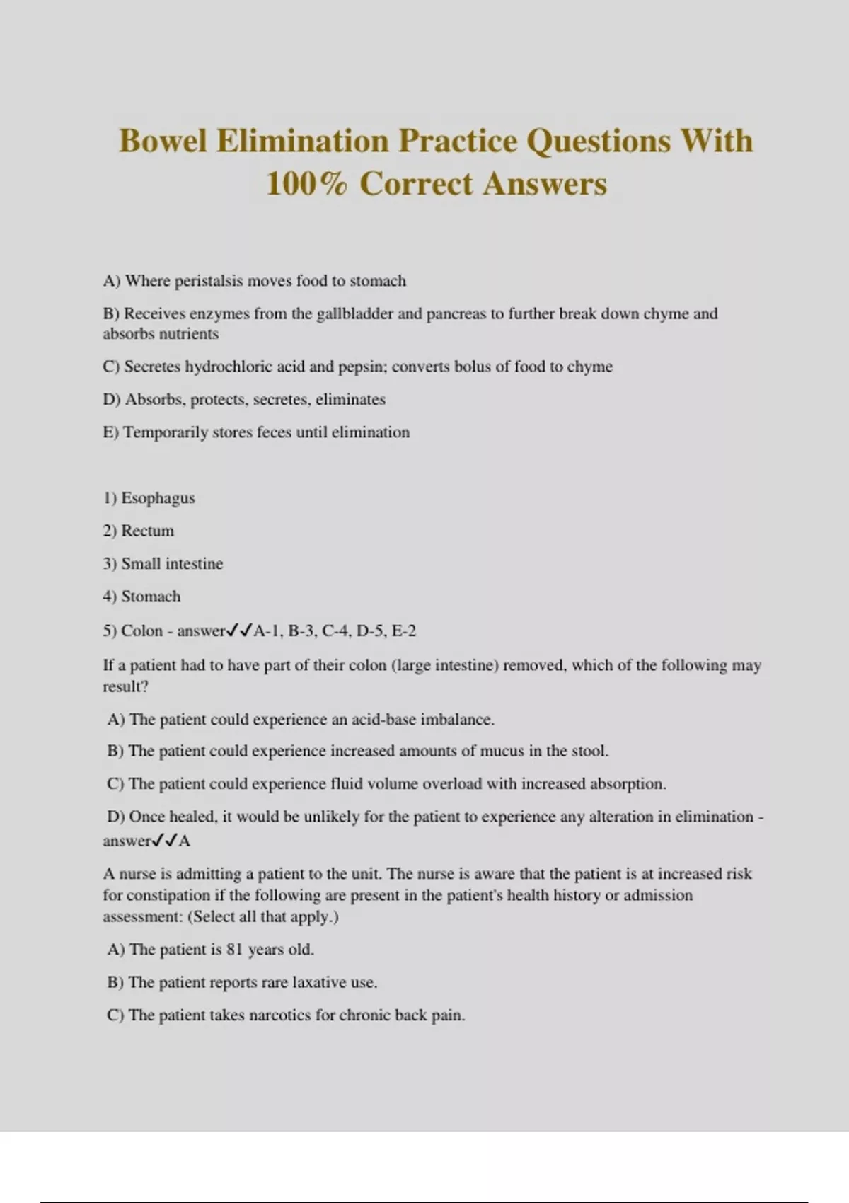Bowel Elimination Practice Questions With 100% Correct Answers A) Where peristalsis moves food to stomach B) Receives enzymes from the gallbladder and pancreas to further break down chyme and absorbs nutrients C) Secretes hydrochloric acid and pepsin; converts bolus of food to chyme D) Absorbs, protects, secretes, eliminates E) Temporarily stores feces until elimination 1) Esophagus 2) Rectum 3) Small intestine 4) Stomach 5) Colon - answerA-1, B-3, C-4, D-5, E-2 If a patient had to have part of their colon (large intestine) removed, which of the following may result? A) The patient could experience an acid-base imbalance. B) The patient could experience increased amounts of mucus in the stool. C) The patient could experience fluid volume overload with increased absorption. D) Once healed, it would be unlikely for the patient to experience any alteration in elimination - answerA A nurse is admitting a patient to the unit. The nurse is aware that the patient is at increased risk for constipation if the following are present in the patient's health history or admission assessment: (Select all that apply.) A) The patient is 81 years old. B) The patient reports rare laxative use. C) The patient takes narcotics for chronic back pain. D) The patient eats whole grains, raw fruits, and green leafy vegetables. E) The patient takes daily iron and calcium supplements. F) The patient reports daily exercise and remains active. - answerA, C, E A student nurse is studying the GI system in preparation for an exam. Which statement indicates correct understanding? A) "Most absorption of water occurs in the small intestine." B) "The ascending colon would be found in the right side of the patient's abdomen." C) "A patient's heart rate may increase with rectal manipulation, such as removing an impaction." D) "The use of opioids for pain relief and antibiotic therapy places a person at risk for developing diarrhea." - answerB An increase in venous pressure caused by liver disease can result in the development of: A) Hemorrhoids B) Flatulence C) Impaction D) Diarrhea - answerA The comatose patient in ICU, who has not had a bowel movement in 4 days suddenly is incontinent of liquid stool. What should the nurse suspect? A) Diarrhea as a result of decreased muscle tone B) Impaction C) The patient had a vagal response D) Flatulence - answerB The nurse is monitoring the patient for a possible vagal response while removing a fecal impaction. If the patient would have a vagal response, what would the nurse most likely observe? A) Tachycardia B) Hypertension C) A decrease in heart rate D) A decrease in respirations - answerC A patient is scheduled for an abdominal computed tomography (CT) scan. Before the scan he must receive a cleansing tap water enema. The nurse should prepare: